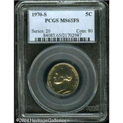 1970-S 5C MS65 Full Steps PCGS. A thin veneer of l <B>1970-S 5C MS65 Full Steps PCGS.</B></I> A thin veneer of light gold toning covers lustrous surfaces. Sharply struck, with well defined steps, though they are not quite full. A few tiny marks are seen on Jefferson's face and coat, and on Monticello. <BR><BR><B>Important notice:</B> Heritage usually auctions material at the rate of 200-250 lots per hour. On some occasions eBay Live bid software or the Internet may not be able to keep up with the pace of the auction. We recommend placing a realistic absentee bid now as insurance to avoid disappointment. Occasionally the auctioneer may eliminate or reject an eBay Live bid, and the auctioneer may also reopen a lot after the close of the eBay live bidding (usually because we missed an audience bid), and may reject your bid even if it shows you as the winning bidder. By bidding via eBay Live, you agree that Heritage may award the lot to another bidder at its sole discretion under the circumstances described above or any other reasonable circumstances. Since eBay bids are not shown to us until we open the lot on the floor, we treat those bids just like floor bids. In most cases the floor responds before the eBay bid is presented to us, due to Internet lag time, so for consistency we have made it a policy that floor bids are always considered first over tie eBay live bids. Also please note that all Heritage lots purchased through eBay Live carry a 20% Buyer's Premium. Please make sure you read the Terms and Conditions before you bid. This lot is being auctioned in conjunction with a live floor auction by Heritage Galleries & Auctioneers. All final auction and invoice information will be supplied by Heritage Galleries & Auctioneers, and all other information should be considered preliminary. Lot:5650