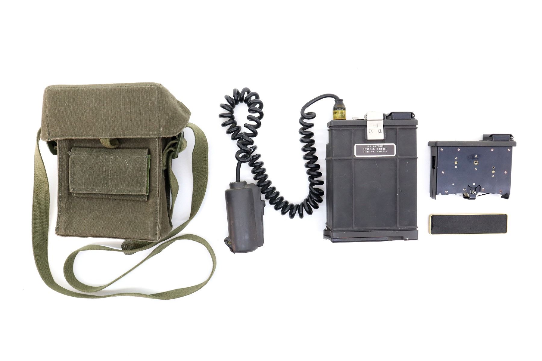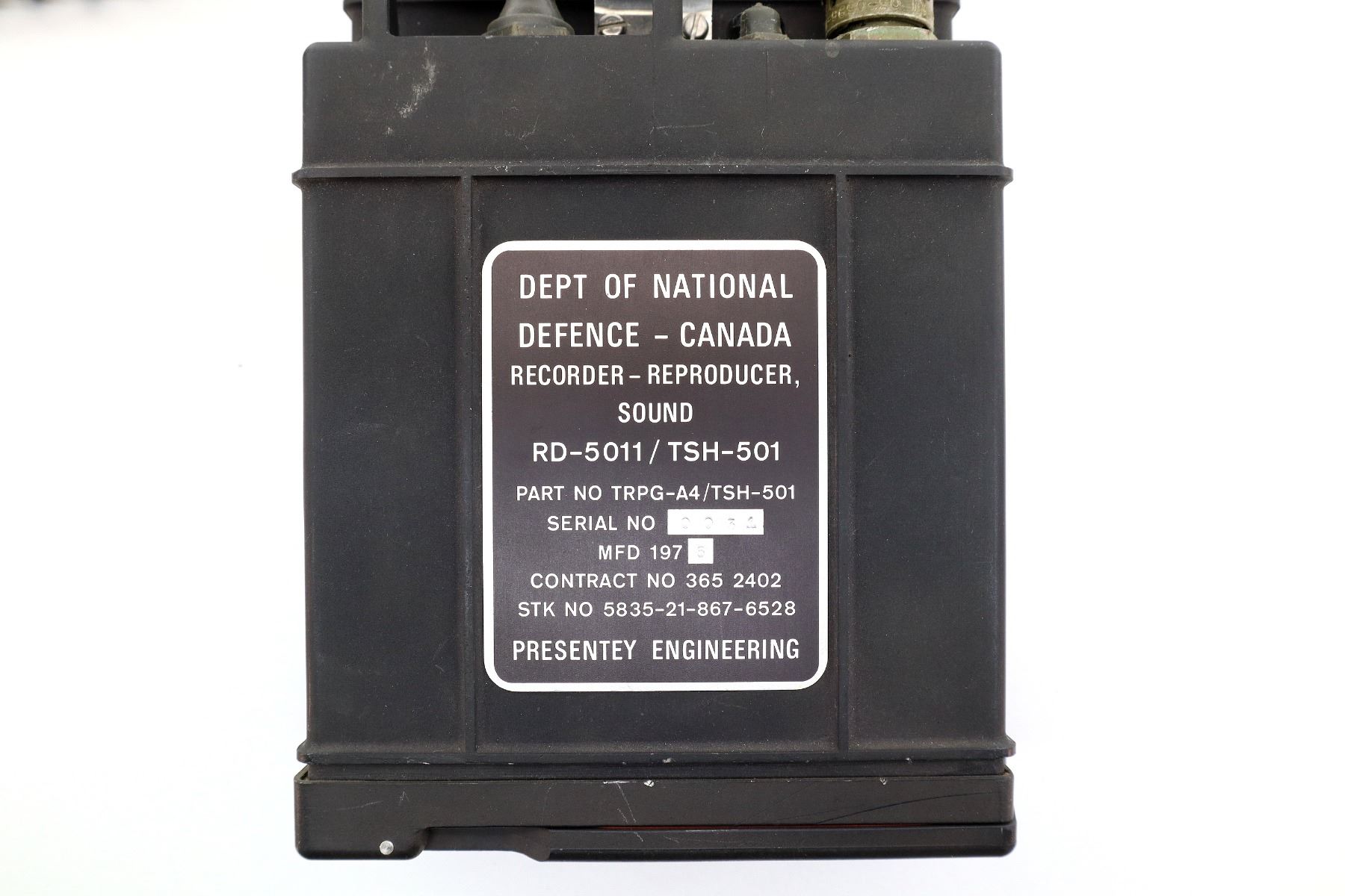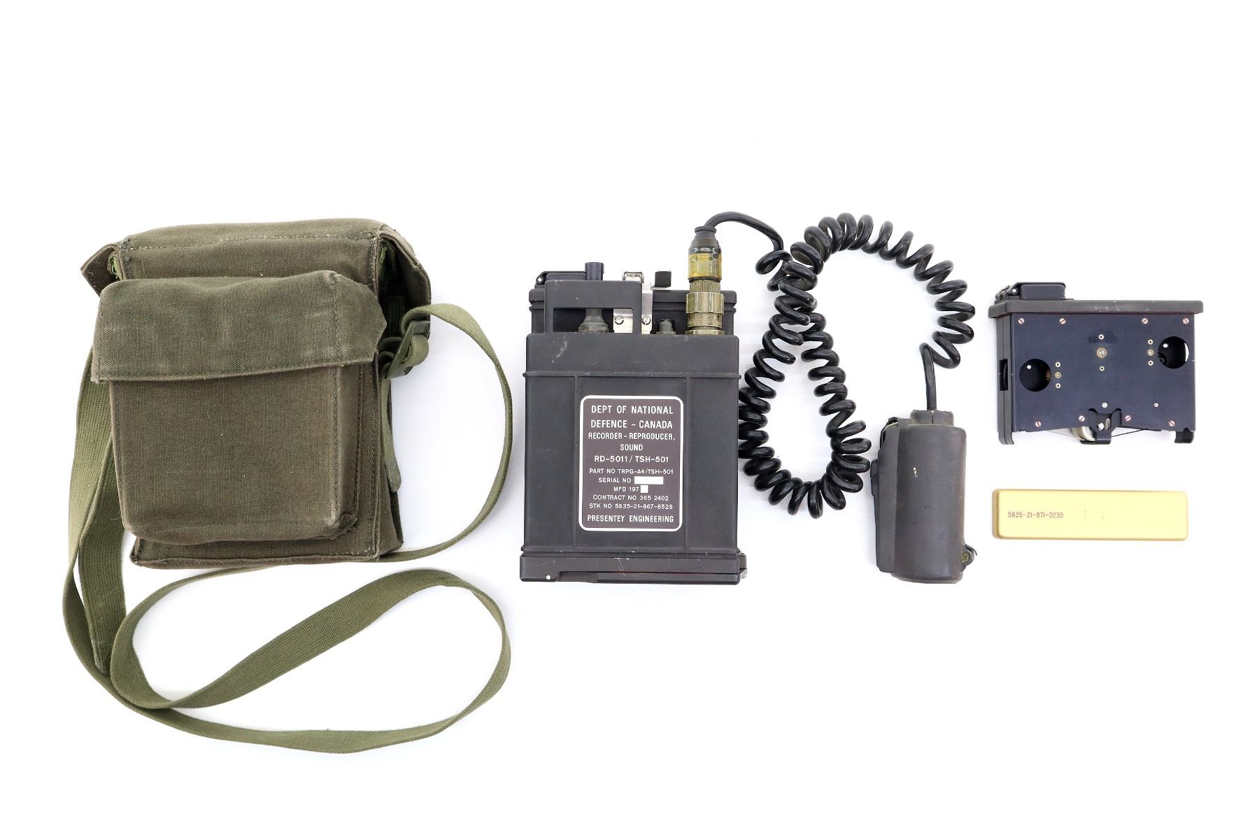 (1) SOUND RECORDING MACHINE, UN-TESTED, MARKED: "MX-5164/TSH-501, 5835-21-869-8762, MAG/TSH-501, PRESENTEY ENG.", "DEPT OF NATIONAL DEFENCE-CANADA, RECORDER-REPRODUCER, SOUND, RD-5011/TSH-501, SERIAL NO 0031, MFD 1975, STK NO 5835-21-867-6528" ETC. & VARIOUS OTHER MARKINGS, MICROPHONE CONNECTED, BATTERY COMPARTMENT, WITH GREEN CANVAS / NYLON CARRY CASE, HAS SHOULDER STRAP, CASE MARKED: "MANTA, MAR, 1975", ALSO HAS SPARE RECORDING TAPE WITH VARIOUS MARKINGS, RECORDING MACHINE APPROX. 4.75" X 2.5" X 7.25". SEE PHOTOS.