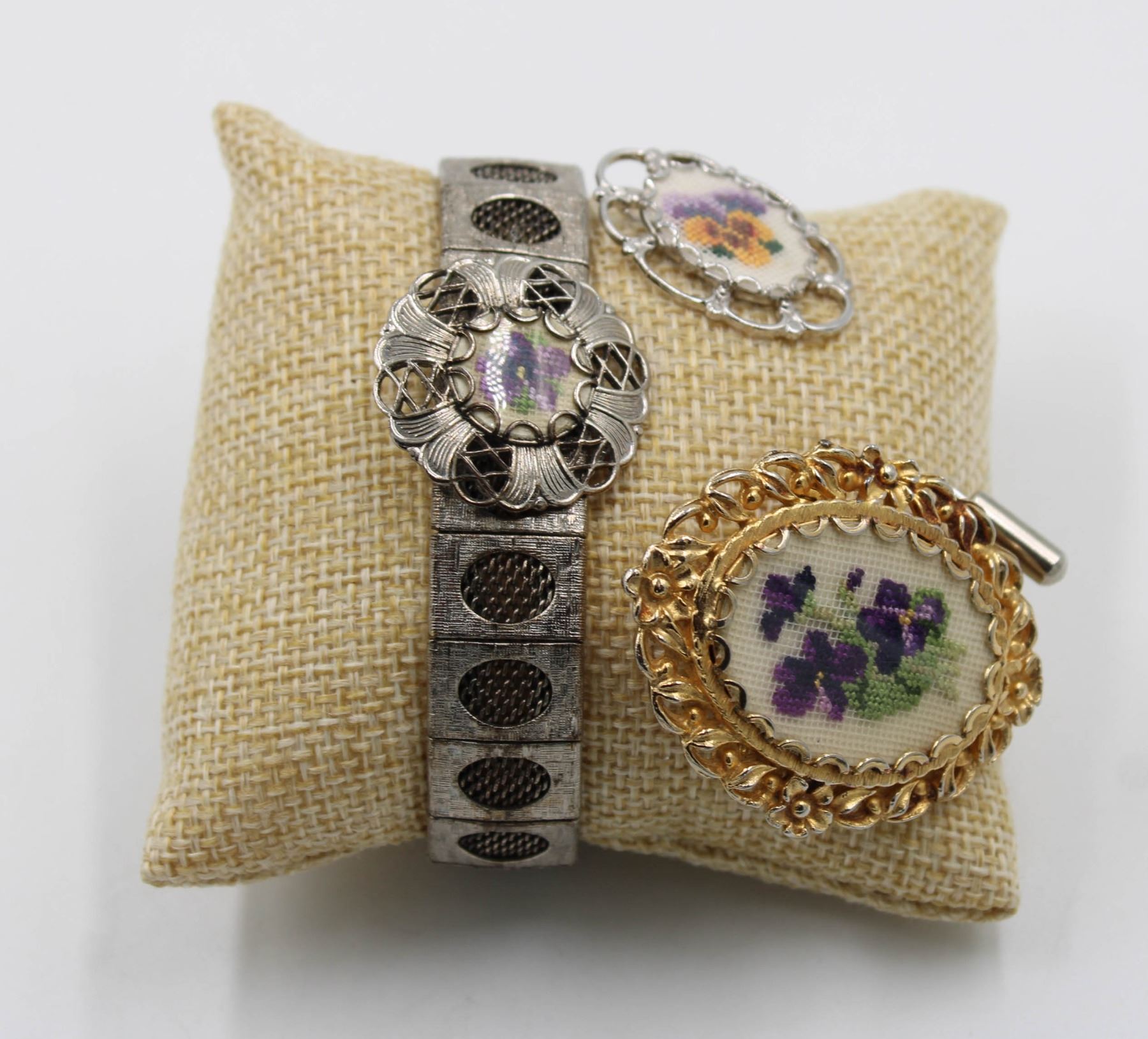 BROOCH&STICK PIN PURPLE & YELLOW PANSIES, BRACELET-7" L WITH A METAL FOLD OVER CLASP CLOSURE, BROOCH- 1-3/4" L & CAN ALSO BE WORN AS A NECKLACE, ON A JEWELRY PILLOW-IN A GIFT BOX