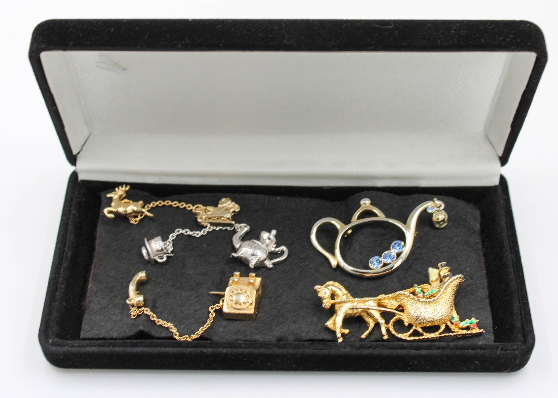 ALONG WITH AVON TEAPOT/CUP & SANTA'S SLEIGH/REINDEER STICK PINS (ALL 3 SIGNED) + 2 VTG BROOCHES, IN A JEWELRY CASE
