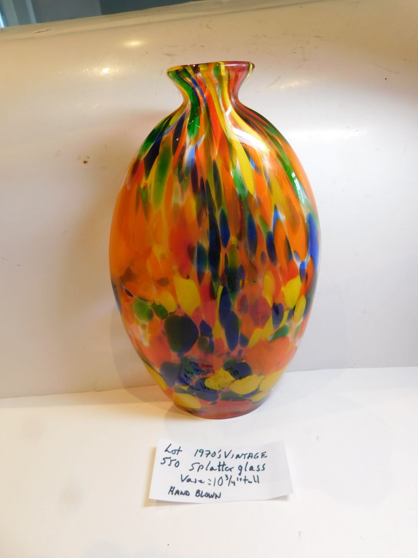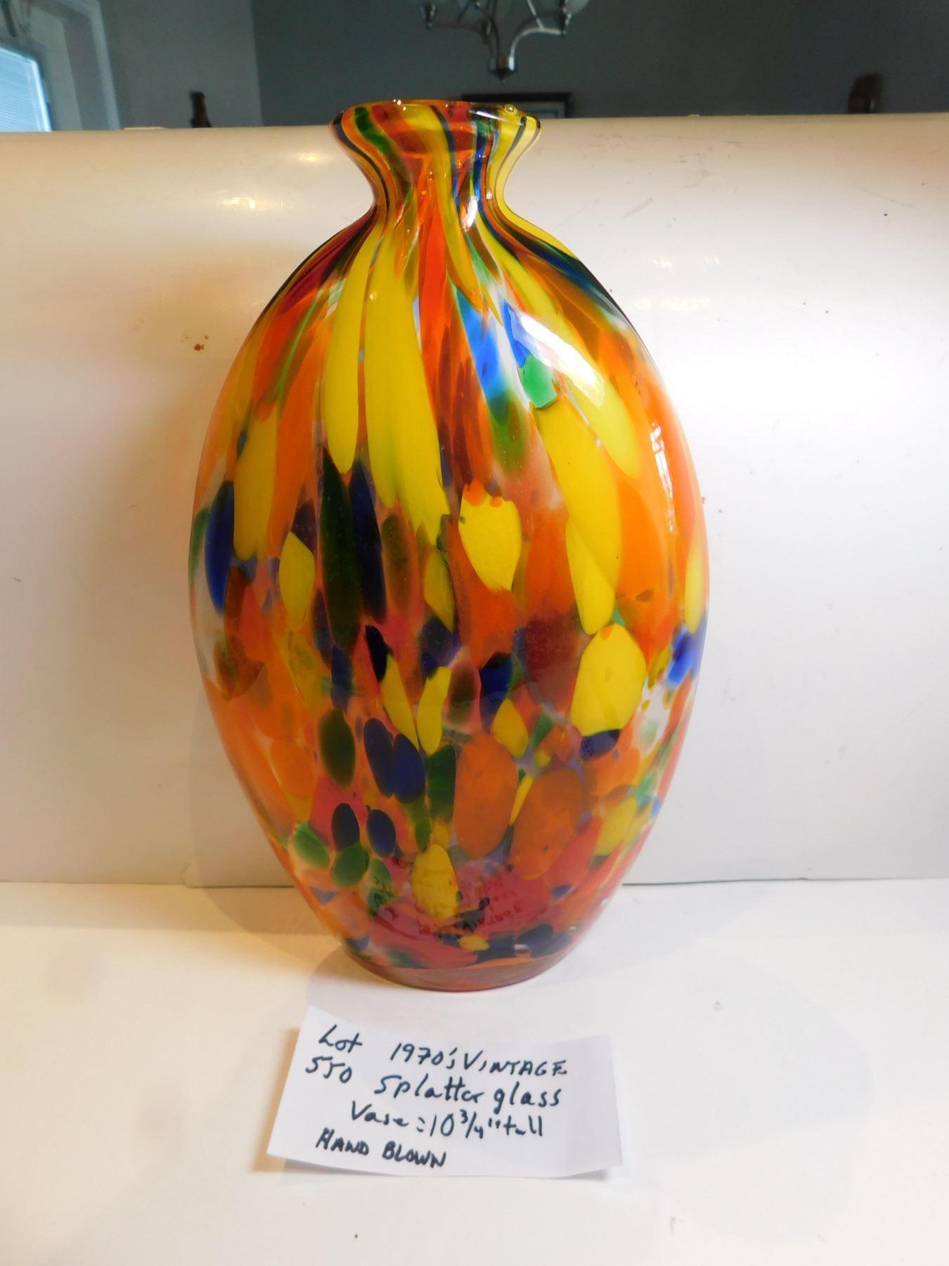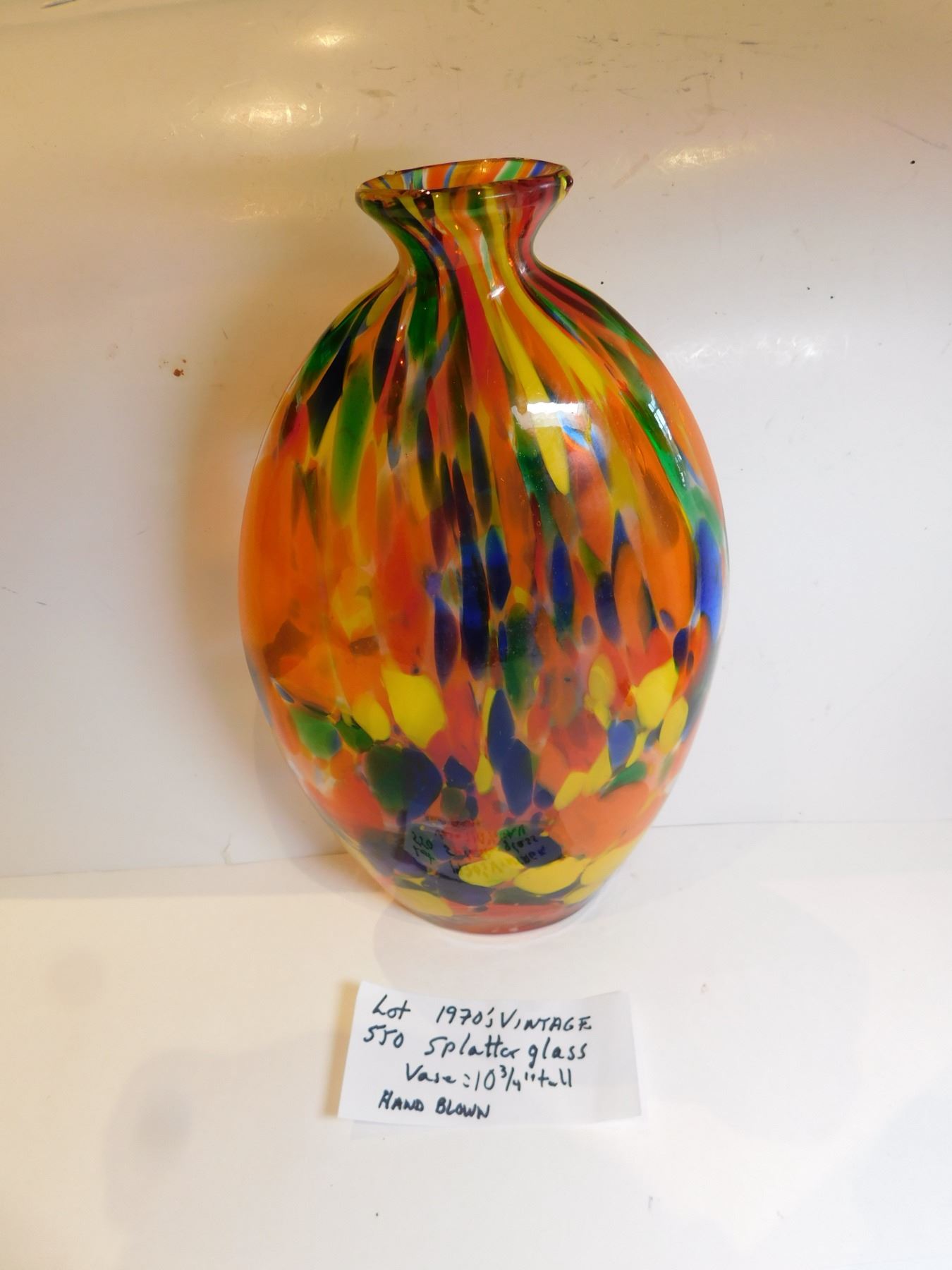1970’S VINTAGE SPLATTER GLASS VASE 10 ¾” TALL