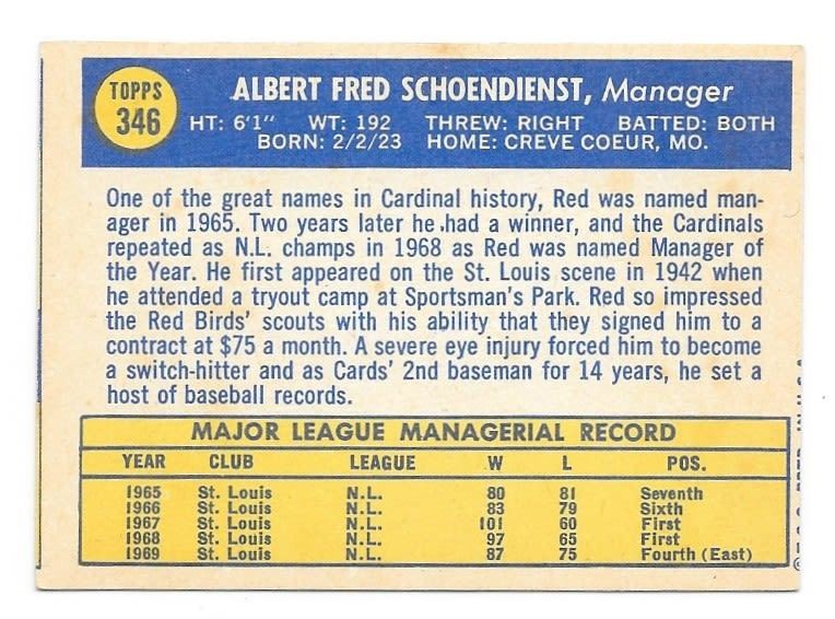 1970 Topps Red Schoendienst Card #346