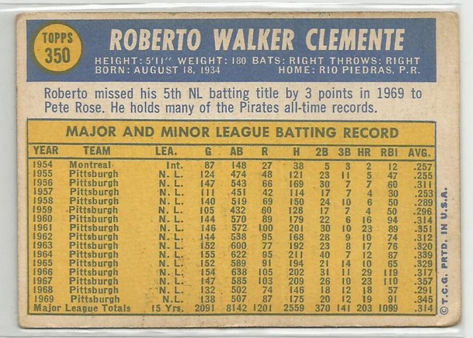 This 1970 Topps Roberto Clemente Card #350 is in Good Condition with soft corners.