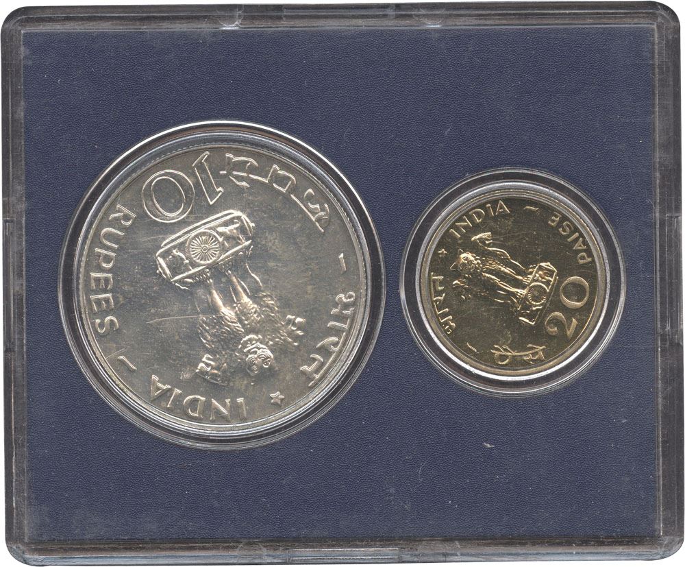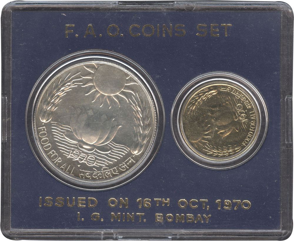 1970,UNC Set, Food for All, 20 Paise and 10 Rupees, Bombay Mint, intact condition of the certificate and cover.