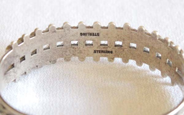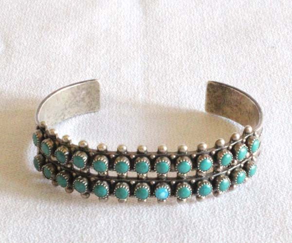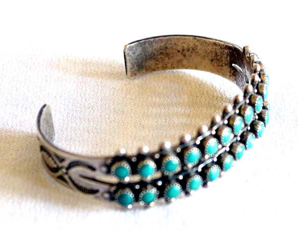 1970's Zuni Petit Point Sterling Bracelet, stamped sterling, nice vintage sterling silver bracelet set with natural blue-green turquoise cabochones, inside measures 6.5'' which includes opening x 5/8''W, traditional hand stamping on both sides of band, truly a gorgeous piece
