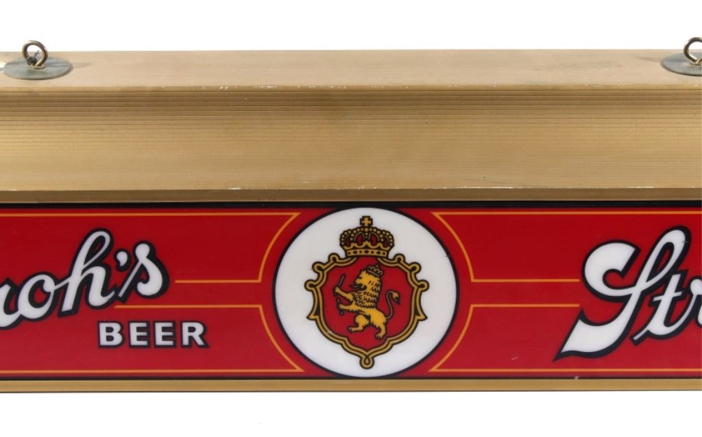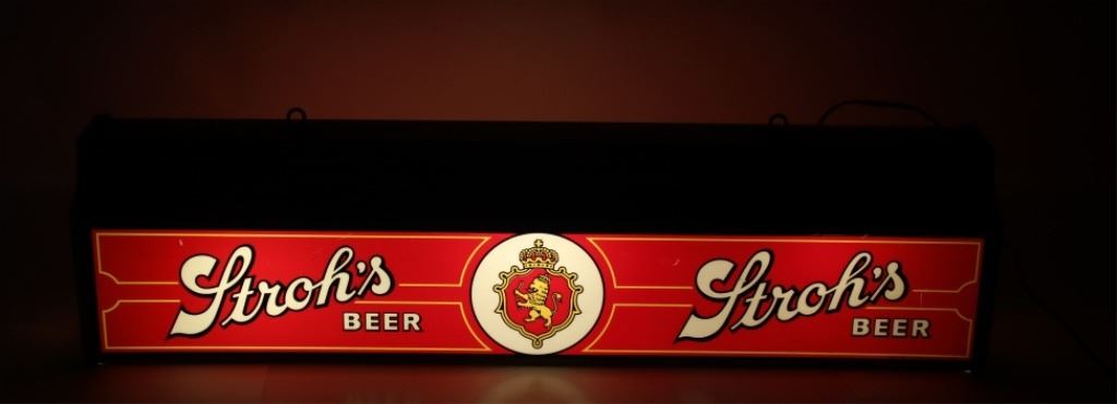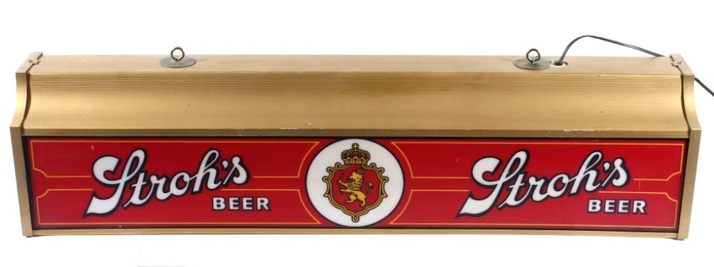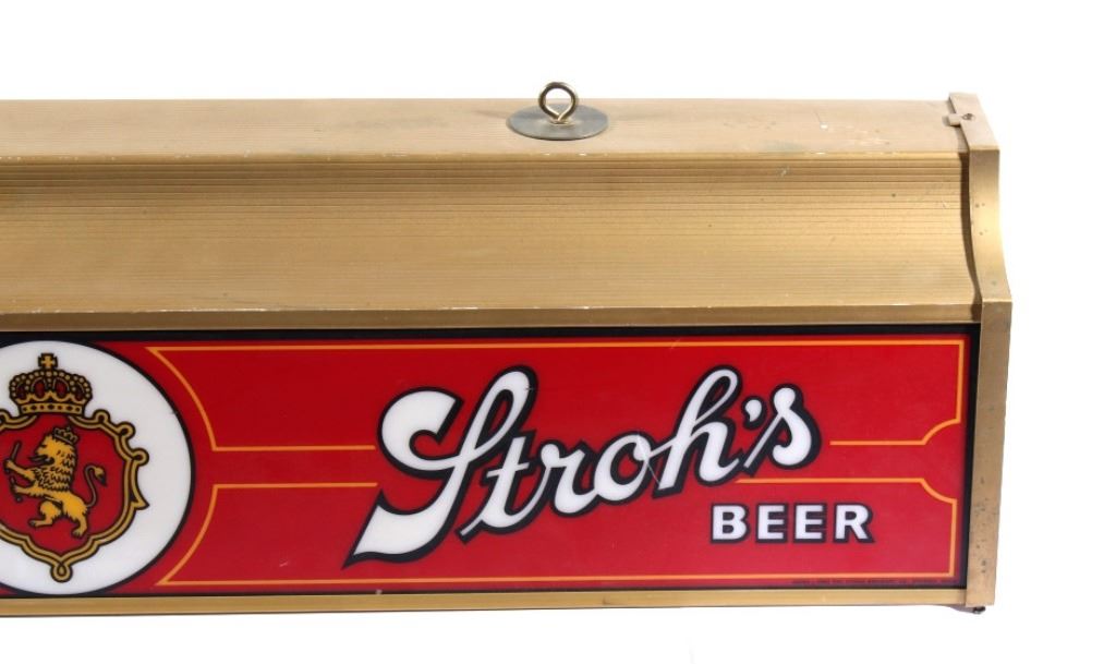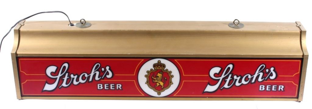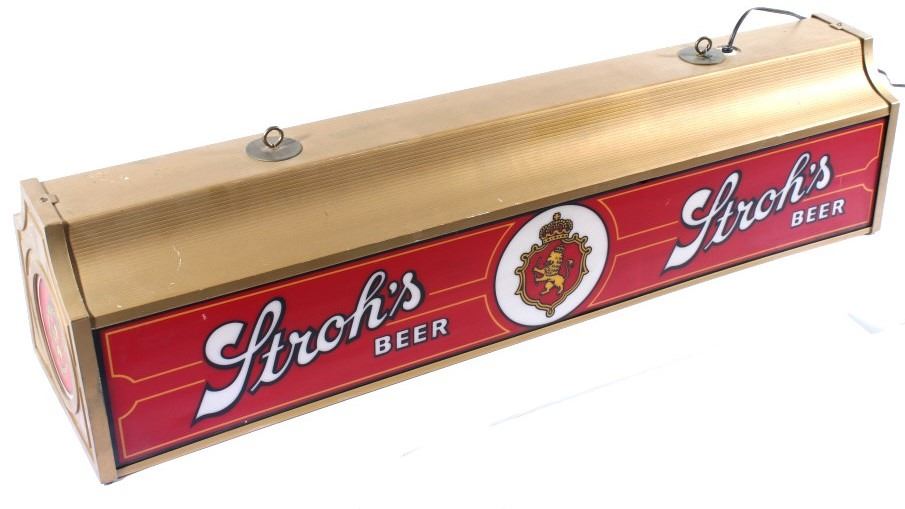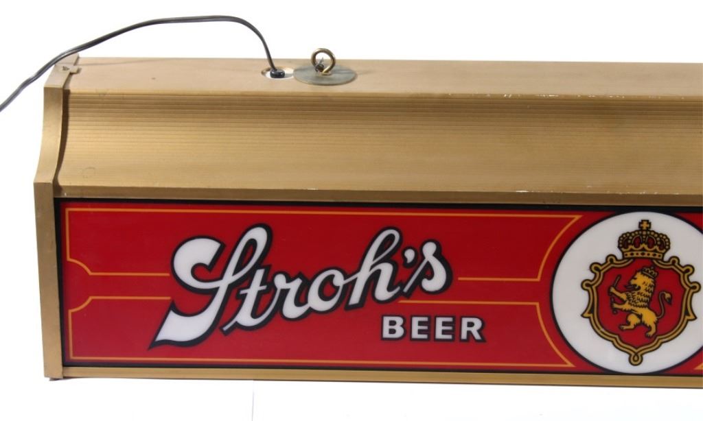 Included in this lot we have a Stroh's Beer billiards table advertising light originating from the 1970's-80's. The pool light shows plastic construction with a metal light housing. The exterior of the light shows a gold colored top, and ends with the red, gold and white Stroh's Lion logo. The sides show red and gold colorations with a white circle at the middle. The sides are marked "Stroh's Beer" twice with the crowned lion logo in the white circle. The light is designed to hang above a pool table to illuminate the playing surface. It shows three interior lights and is in working order. The piece shows good condition overall with some wear due to age and it is missing its hanging chains. The pool light measures 37 5/8" long by 8 1/2" wide and 9" tall.
