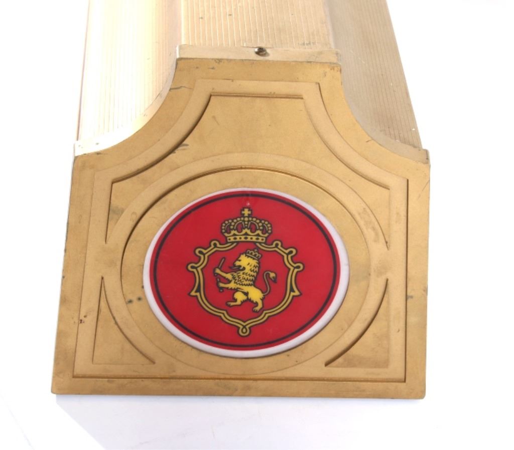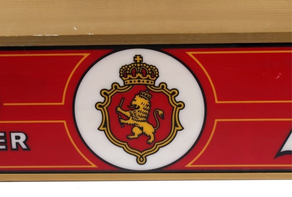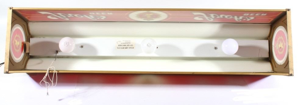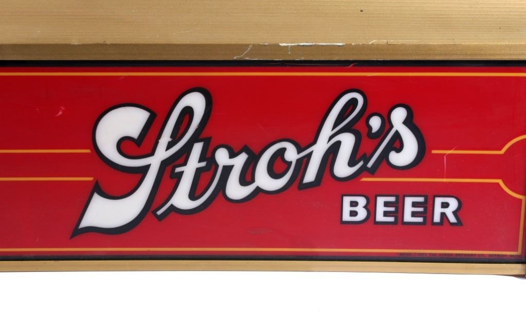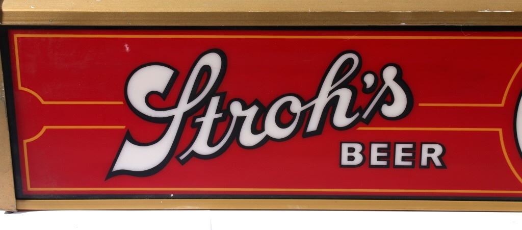 Included in this lot we have a Stroh's Beer billiards table advertising light originating from the 1970's-80's. The pool light shows plastic construction with a metal light housing. The exterior of the light shows a gold colored top, and ends with the red, gold and white Stroh's Lion logo. The sides show red and gold colorations with a white circle at the middle. The sides are marked "Stroh's Beer" twice with the crowned lion logo in the white circle. The light is designed to hang above a pool table to illuminate the playing surface. It shows three interior lights and is in working order. The piece shows good condition overall with some wear due to age and it is missing its hanging chains. The pool light measures 37 5/8" long by 8 1/2" wide and 9" tall.
