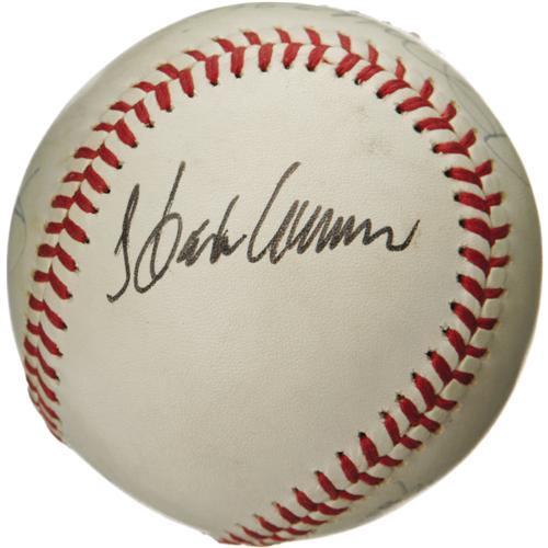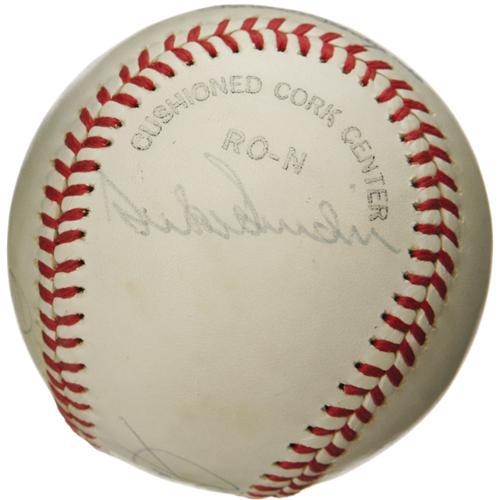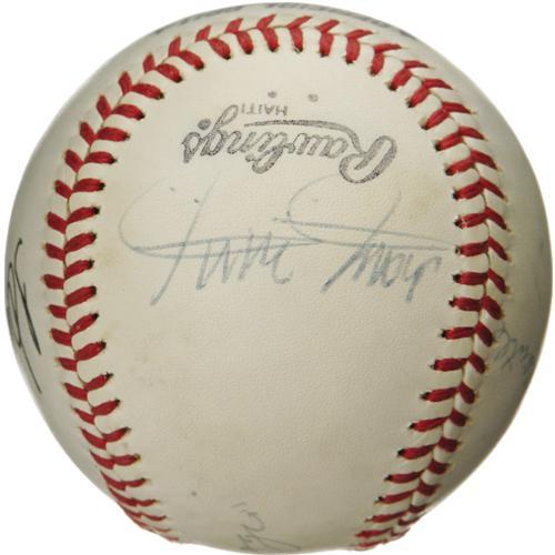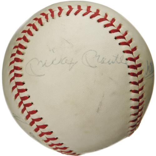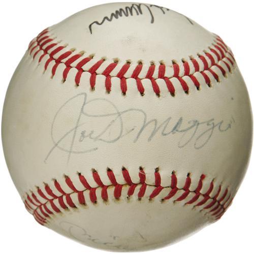 <B>1970's Legendary Sluggers Signed Baseball with DiMaggio, Mantle, Aaron.</B></I> Believed to have derived from a New York Mets Old Timers Day function, this ONL (Feeney) ball brings together five of the greatest sluggers of the modern era. DiMaggio claims the sweet spot in 9/10 blue ink, with Willie, Mickey and the Duke appearing in the same boldness and hue. Hammerin' Hank appears in 10/10 black felt tip. Very mild toning does nothing to diminish visual appeal. <I>LOA from PSA/DNA. LOA from James Spence Authentication.</B></I><BR><BR><b>Shipping:</b> Balls, Pucks, etc., Small (<a target="_blank" href="http://www.heritageauctions.com/common/shipping.php">view shipping information</a>)