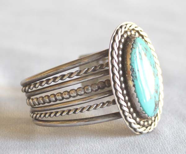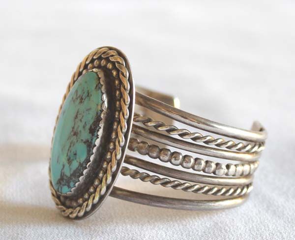 1970's Navajo Sterling Turquoise Bracelet, inside measures 6.5'' which includes opening x 2''W, large sterling silver bracelet set with a blue turquoise cabochon (measuring .75''W x 1 7/8''L) with black matrix, unsigned, stamped sterling, multi-band bracelet, 57.75g in total wt. Stunning piece!