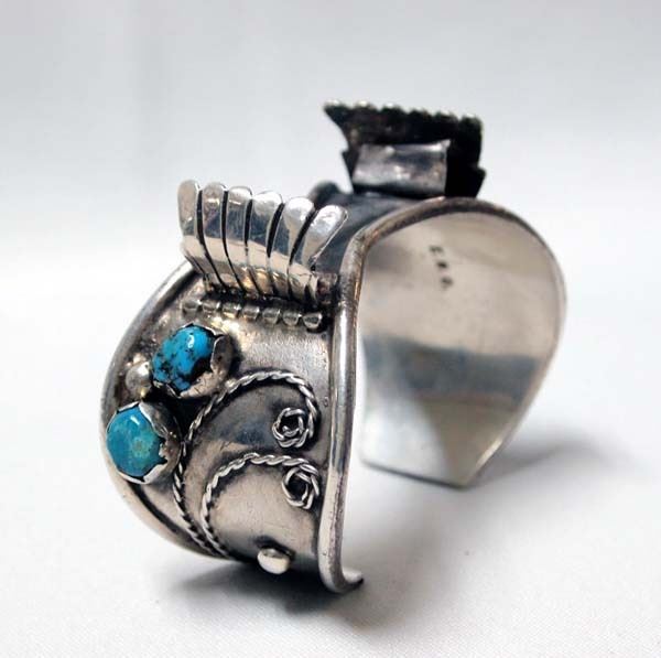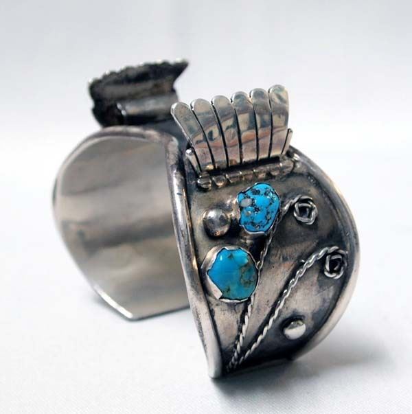 1970's Native American Navajo Sterling Silver and Turquoise Watch Bracelet by Ernest McCrea, inside measures 7'' which includes the opening x 1.5''W (at widest point), hallmarked E.M.C. and has a total wt. of 62.7g