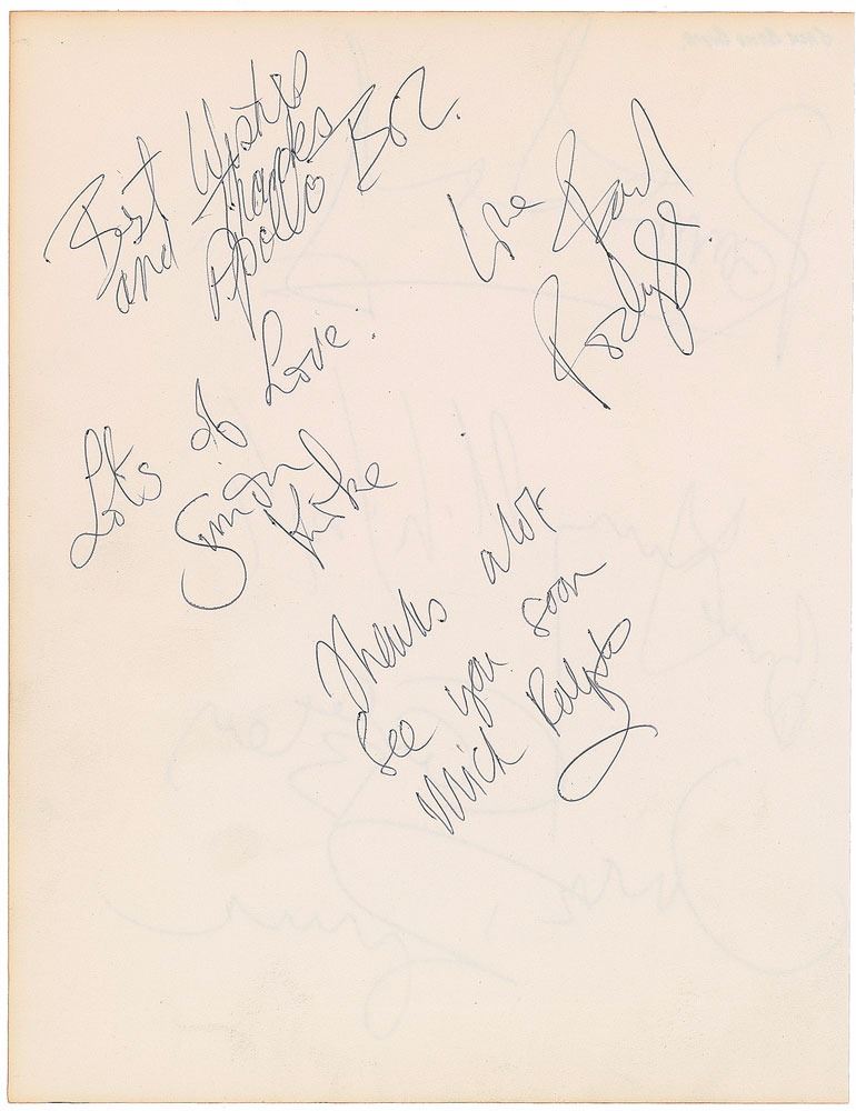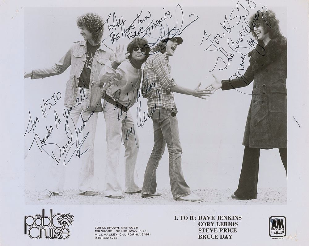 Collection of three items: circa 1974 ballpoint signatures and inscriptions by Bad Company, "Best Wishes, and Thanks Apollo, Boz [Burrell]," "Lots of Love, Simon Kirke," "Love, Paul Rodgers," and "Thanks a lot, see you soon, Mick Ralphs," on an off-white 7.25 x 9.5 album page, also signed on the reverse by the Jack Bruce Band, including Jack Bruce, Mick Taylor, Carla Bley, Ronnie Leahy, and Bruce Gary; a vintage glossy 10 x 8 A&M Records promotional photo of Pablo Cruise, signed and inscribed in black felt tip to radio station KSJO by Dave Jenkins, Cory Lerios, Steve Price, and Bruce Day; and an uncommon glossy 8 x 10 group publicity photo of Natural Gas, signed in black felt tip by all four members: Peter Wood (ins), Joey Molland, Mark Clarke, and Jerry Shirley. In overall fine condition. Bad Company is pre-certified by REAL. Both of the others have been seen by PSA/DNA and Roger Epperson (REAL) but, due to lack of exemplars, have not issued an official opinion.