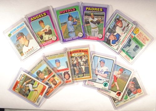 Star Card Lot. 1970 Topps #67 & 68, 1972 Topps #442, 1973 Topps #63, #174 Gossage Rookie, #305 Mays, 1974 Topps #10 Bench, 1975 Topps #61 Winfield, #228 Brett Rookie, #500 Ryan, 1977 Topps #234 Ryan, 1978 Topps #206 Leaders, 1979 Topps #417. Book Value $275.00.