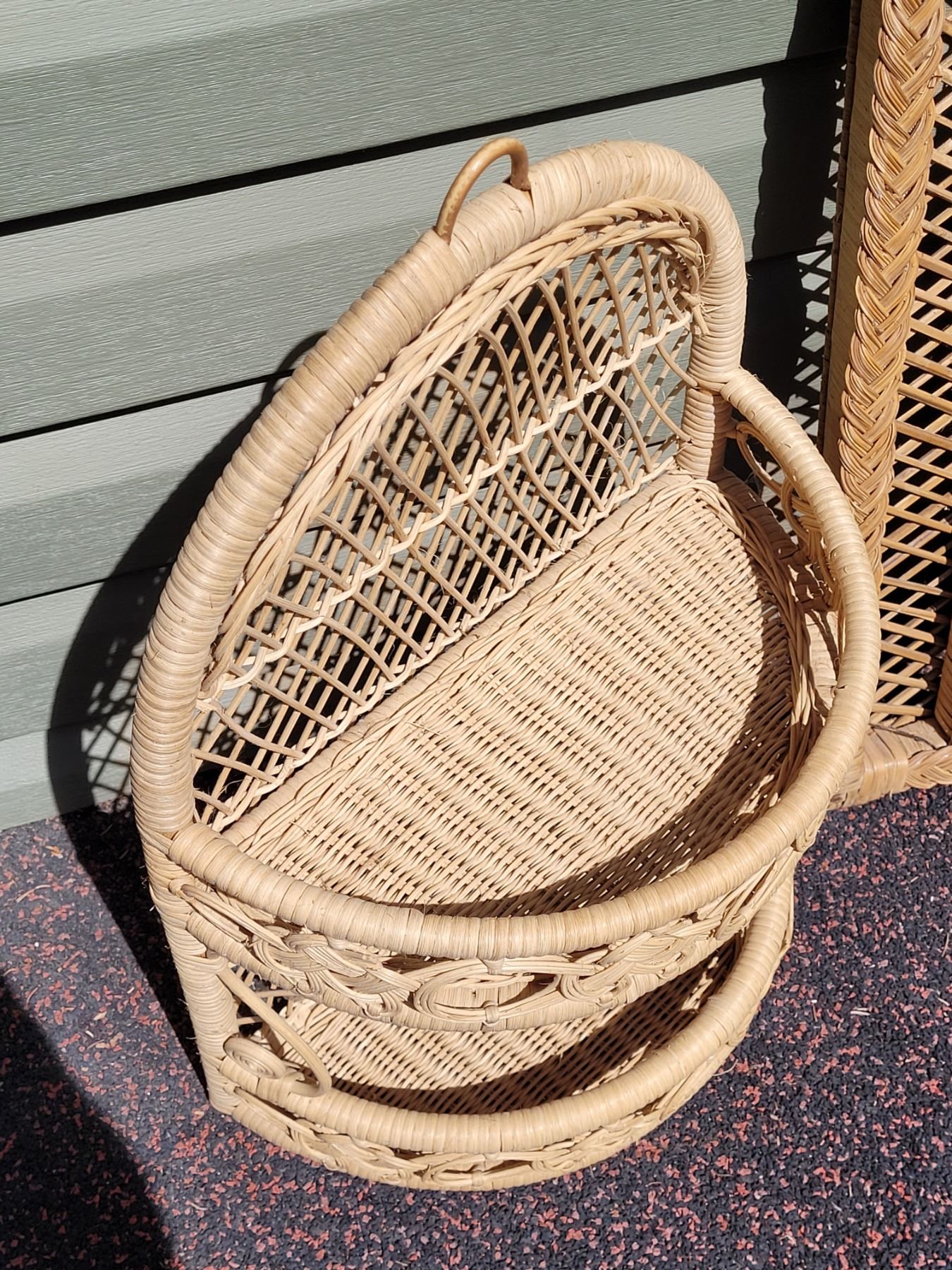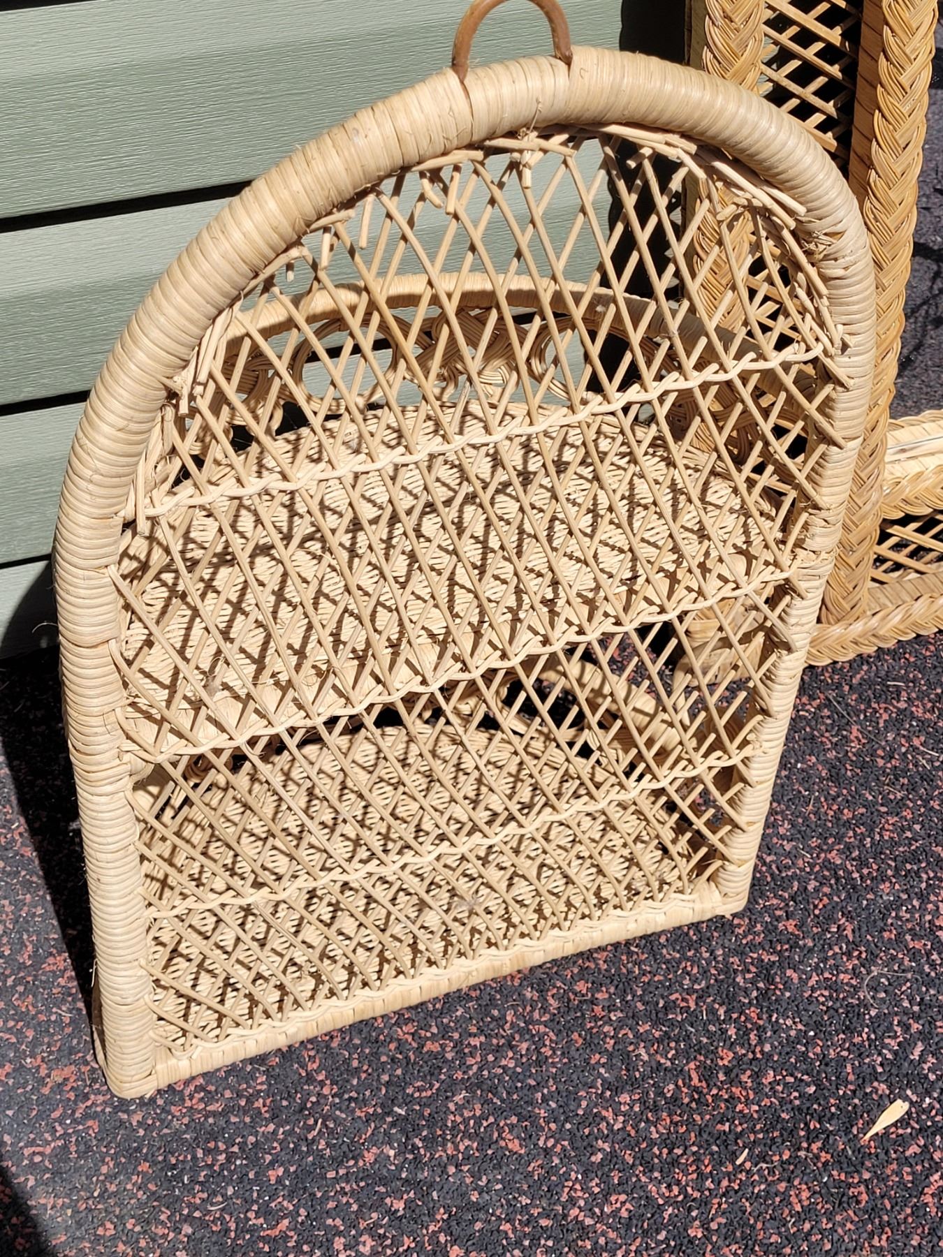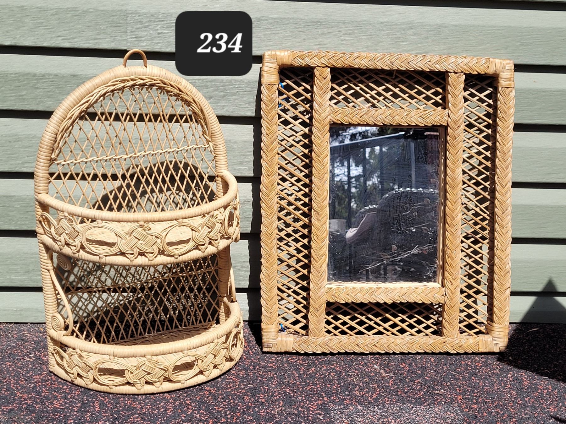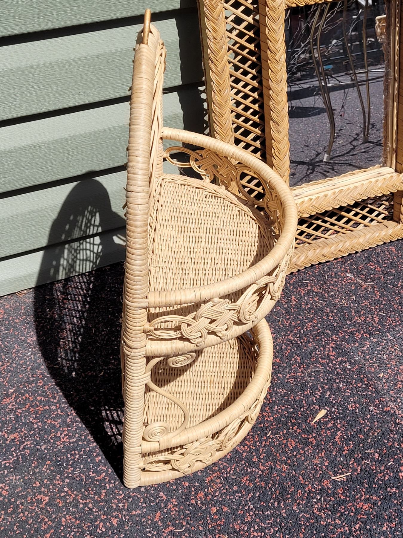1970's wicker wall shelf & mirror.