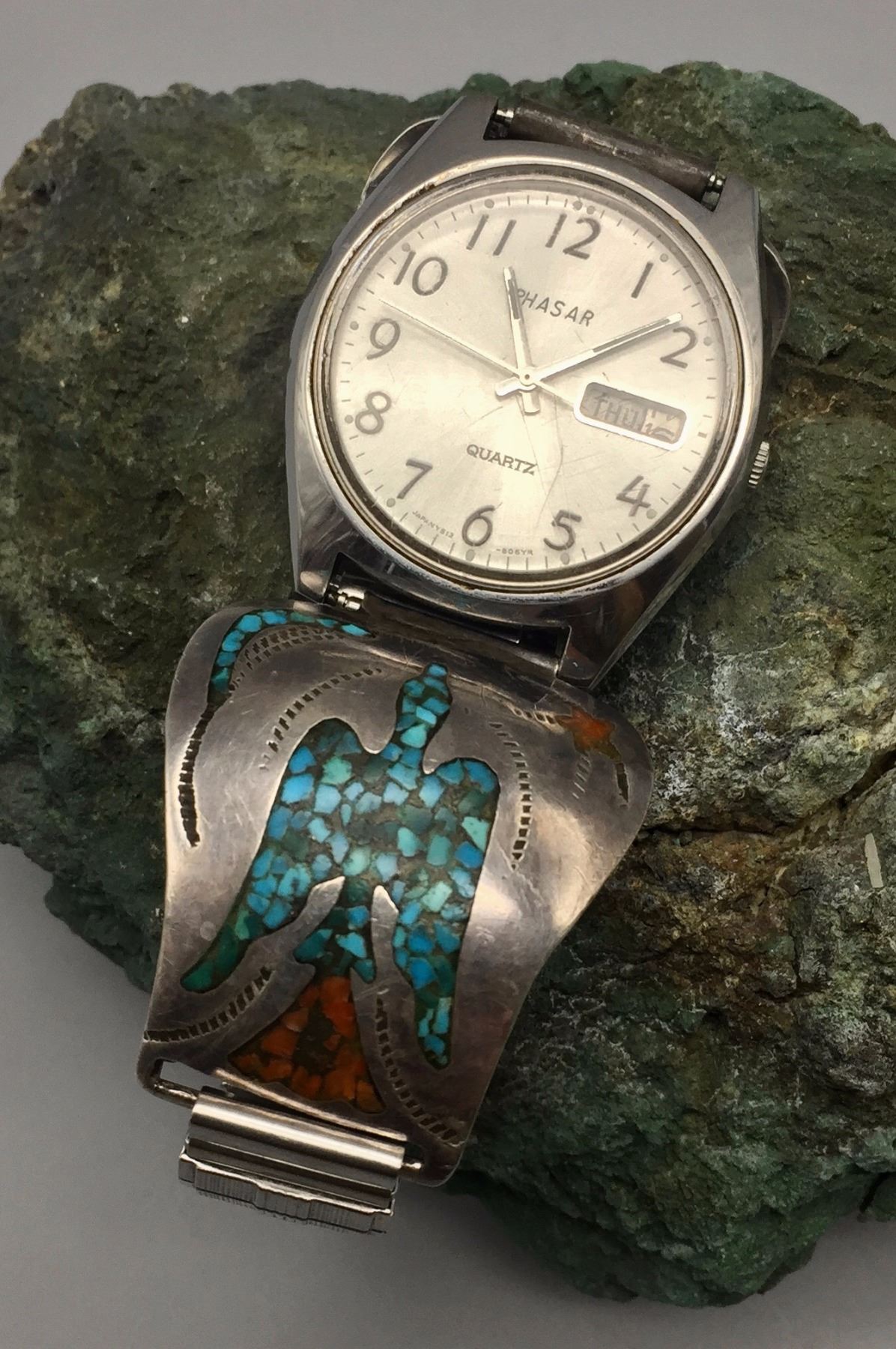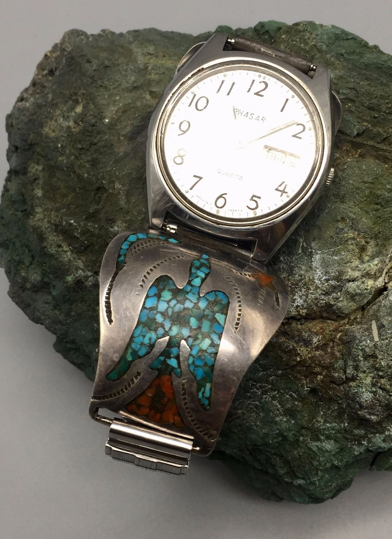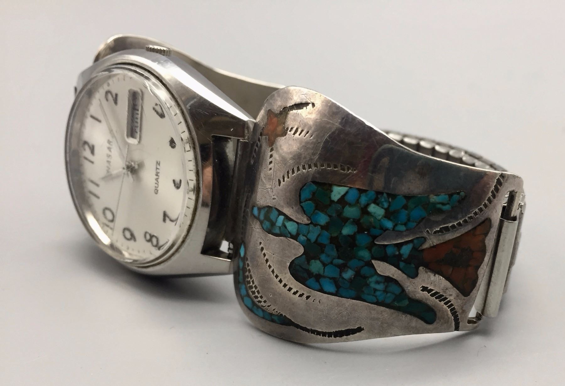 Maker: Unmarked, but vintage Navajo style. Approx. Age: Circa 1970s. Size: Weighs 72.9g all together. Condition: Good for its age, normal wear expected. Watch face not going, may need a battery. Additional Info: Chip inlay set in sterling silver with a stretchy watch band. Please look closely at the pictures - they are an important part of our description. Shipping: There will be a $5 handling / packaging fee for shipping this lot. The actual cost of postage will be added on top of that.