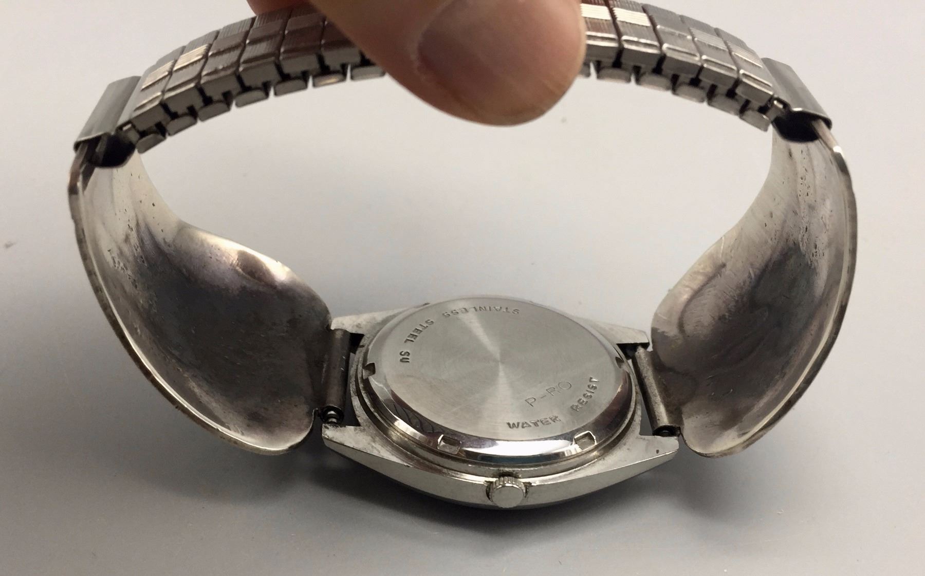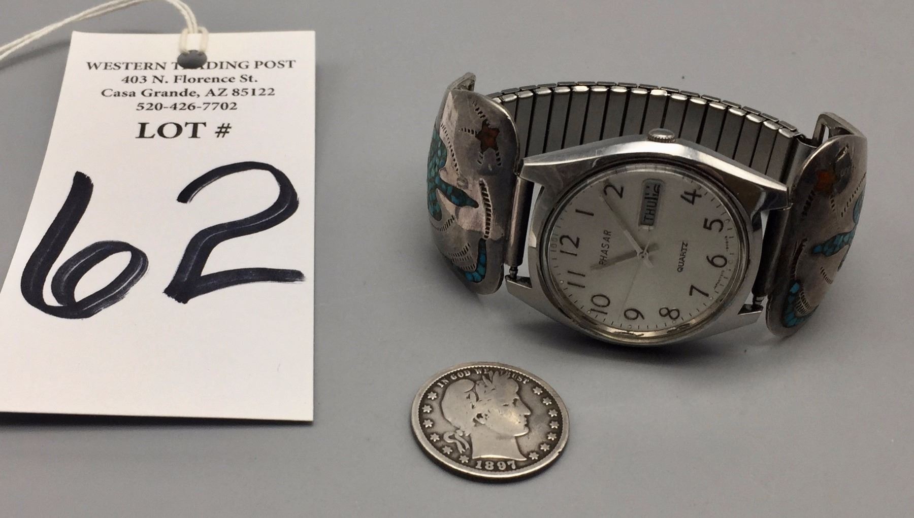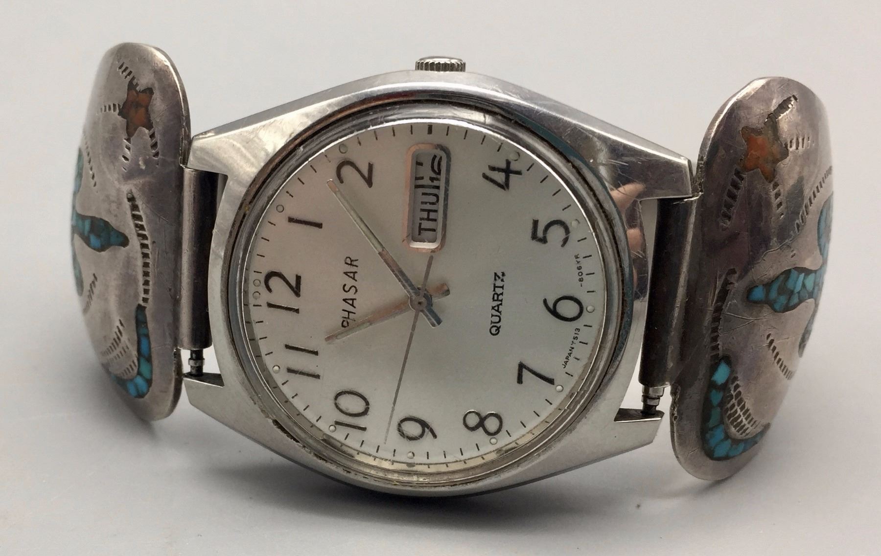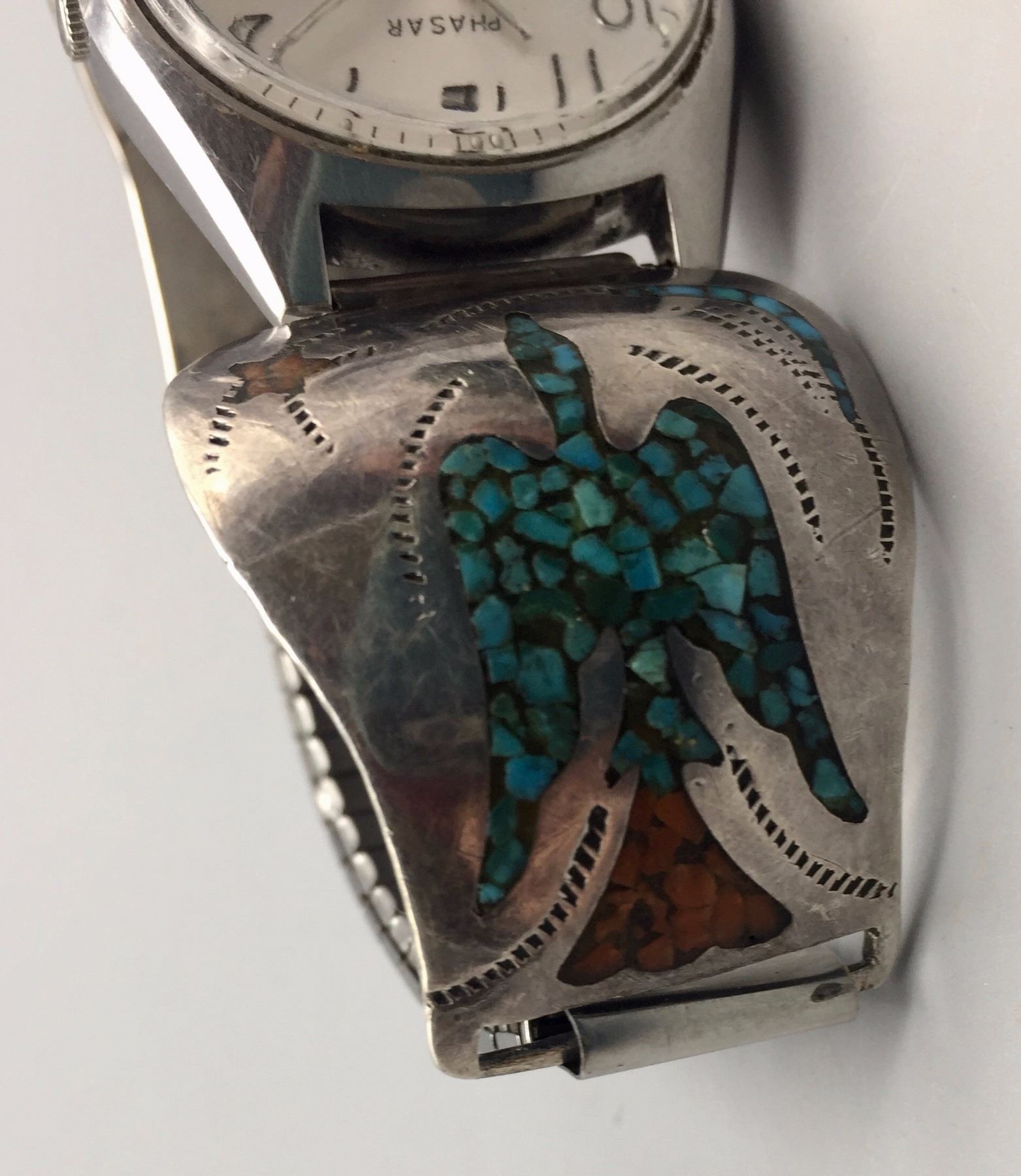Maker: Unmarked, but vintage Navajo style. Approx. Age: Circa 1970s. Size: Weighs 72.9g all together. Condition: Good for its age, normal wear expected. Watch face not going, may need a battery. Additional Info: Chip inlay set in sterling silver with a stretchy watch band. Please look closely at the pictures - they are an important part of our description. Shipping: There will be a $5 handling / packaging fee for shipping this lot. The actual cost of postage will be added on top of that.