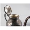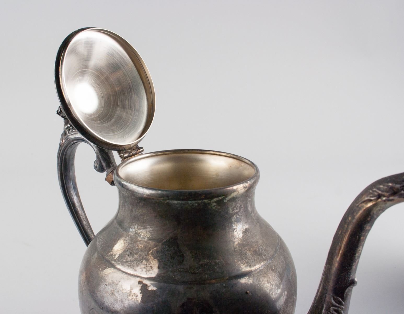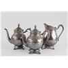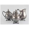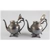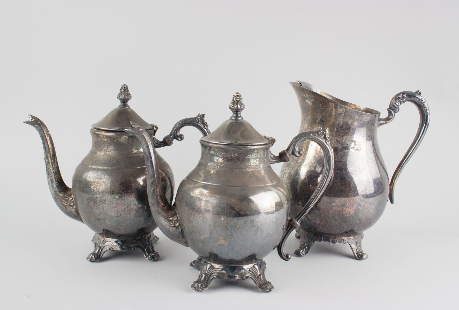 United States F.B. Rogers silver plated teapot and pitcher set; of 2 teapots, of globular body, supported on four legs, flanked with long curved handle and spout; decorated with floral carving; pitcher with same design elements; F.B. ROGERS mark and material brass mark on base; 1970s; 24 cm x 19 cm, 806 grams