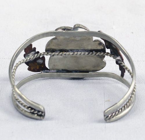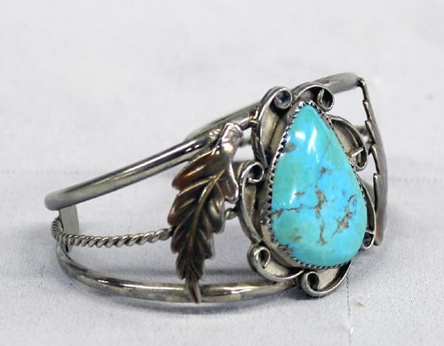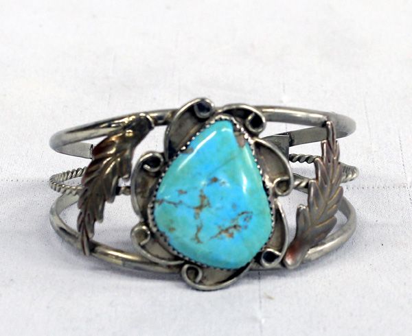 1970s Navajo Sterling Turquoise Bracelet, older piece of jewelry, sterling silver set with a turquoise cabochon (7/8" x 1 1/8") interspersed with golden brown matrix which is accented on each side with traditional leaf motif, unsigned, sawtooth and silver swirl design bezel, inside measures approx. 6.5'' which includes opening x 1.5''W