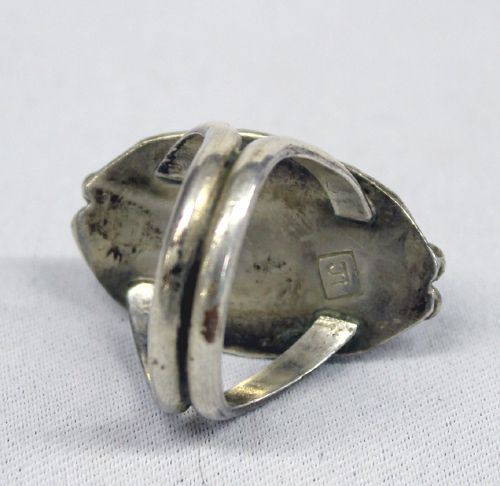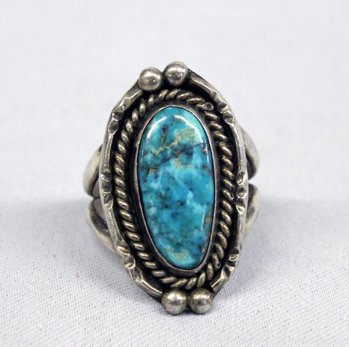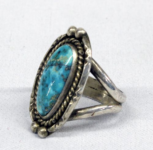 1970s Navajo Sterling Turquoise Ring hallmarked JT, vintage sterling silver ring set with natural turquoise cabochon (3/8" x 7/8" and has tight hairline crack, however does not distract from the ring), bezel has twisted silver and handstamped silver accents, size 12, 1.25''L