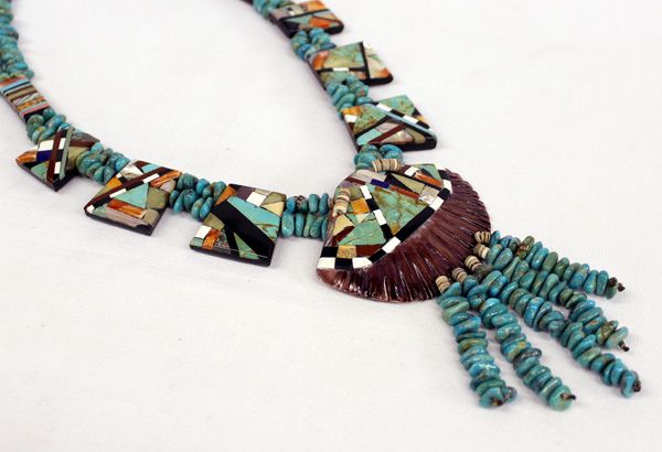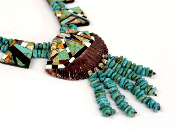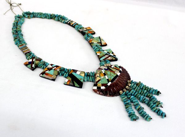 1970s Santo Domingo Inlay Shell Necklace, necklace features 8 stone to stone inlay pieces of red shell, abalone, jet, soapstone and turquoise, the center focal piece is an inlay purple scallop shell with 5 turquoise and heishi shell dangles 3in L, this beauty is brought together with beautiful polished turquoise nugget beads, measures 28in end to end, square inlay bead is 1in x 1in, shell pendant including dangles 5.25in x 3in, string tied, truly a stunning piece