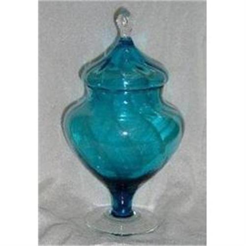 This aqua compote with lid is as eye-catching as it is delicate. Produced by Pilgrim Glass Company of Ceredo, West Virginia, one of the premier manufacturers of American art glass, it shows what I call an "optic swirl" pattern, better known as the diamond optic pattern. It is hand-blown, as its occasional air bubbles attest. The diamond pattern twists up from the bottom and changes to a tighter pattern at the top of the compote to a crystal knob, for a mesmerizing effect. The compote measures 8 1/2 inches tall, from the bottom to the crystal knob on the top of the lid; the compote width is 5 7/8 inches. It is in perfect condition. <p>Shipping is determined after checkout. <p>