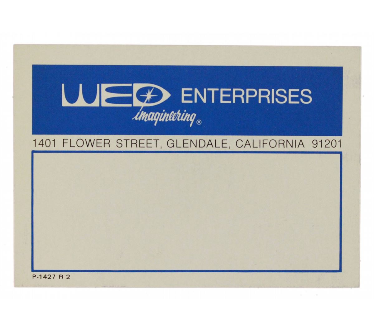A rare unused WED Enterprises Imagineering adhesive label. The label measures 3.5"x5" and is in very fine condition, with very mild wear to the surface of the label. Edges and corners are in near-mint condition.
