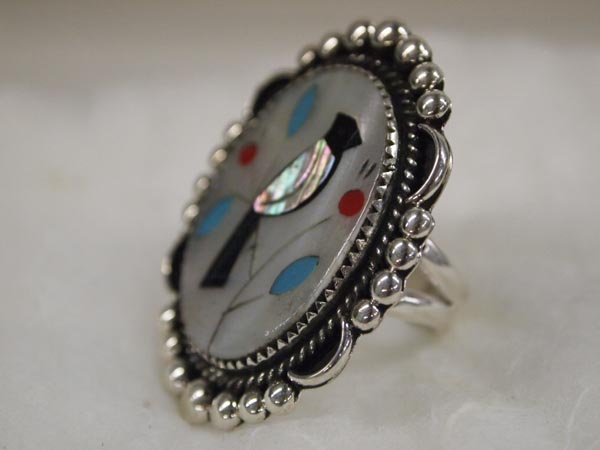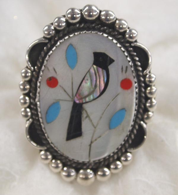 1970s Native American Zuni Inlay Silver Ring Hallmarked ''JM'' for Juan Martinez. Inlaid bird design. Size 8. Buyers pay actual shipping and handling charges (see terms and conditions for more information.)