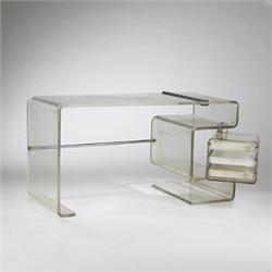 1970s desk USA acrylic, stainless steel 56.5"w x 23.75"d x 30"h This desk features a swiveling drawer case containing three sliding drawers.