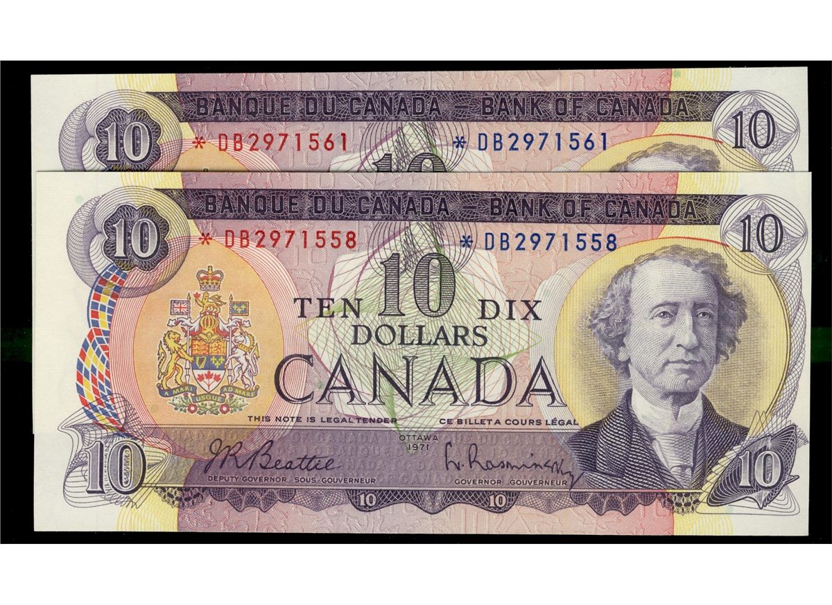 1971 $10 BC-49aA #*DB2971558 & *DB2971561. Lot of 2 notes both crisp AU/UNC issues.