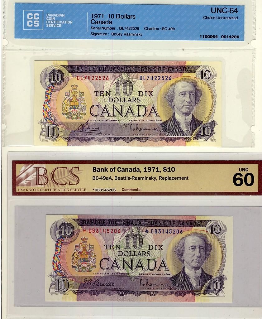 1971 $10 BC-49aA #*DB3145206 & BC49b #DL7422526. Lot of 2 notes BCS graded UNC 60 and UNC 64 repectively.