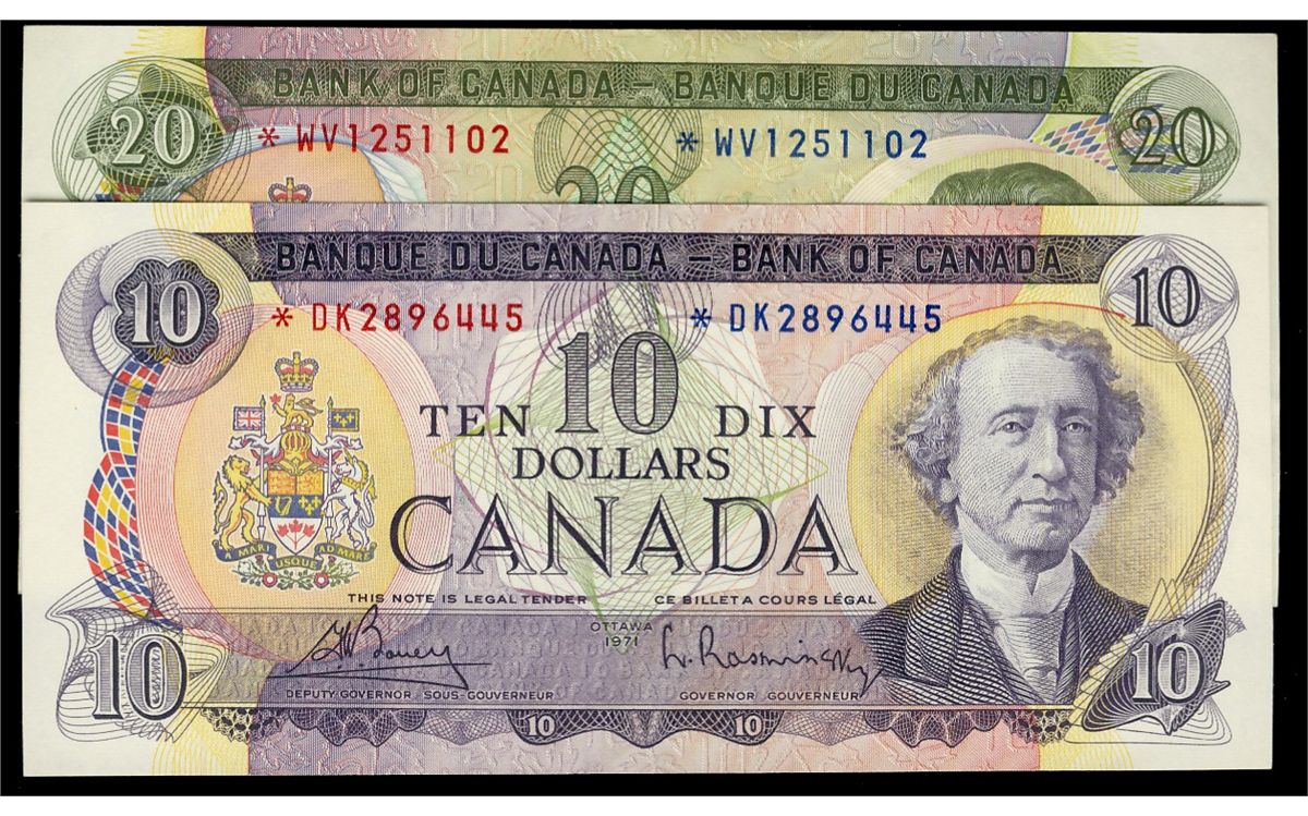 1971 $10 BC-49bA #*DK2896445 UNC & $20 BC-50bA #*WV1251102 VF. Lot of 2 notes.