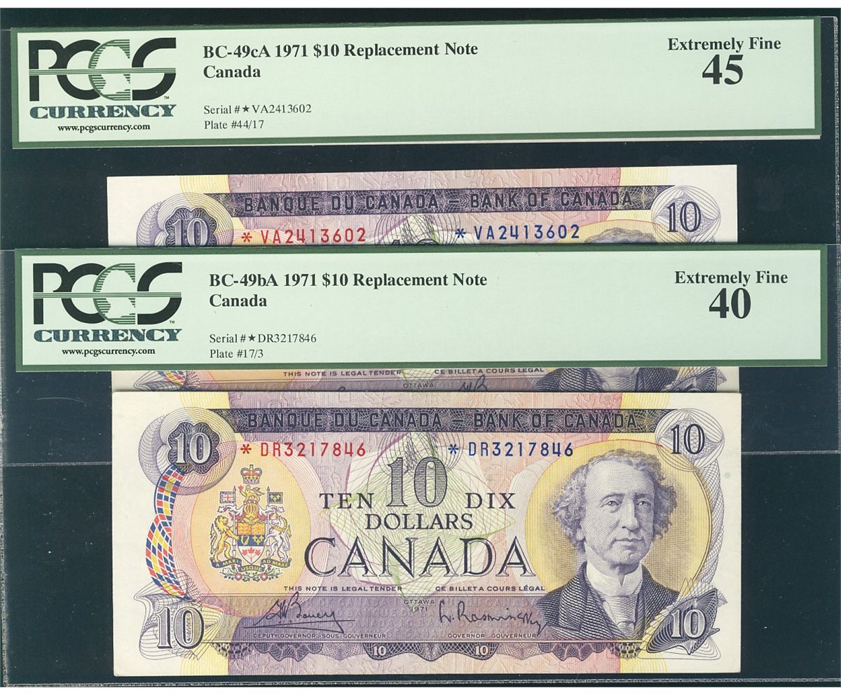 1971 $10 BC-49bA #*DR & BC-49cA #*VA PCGS EF40 & EF45 respectively. Lot of 2 notes.