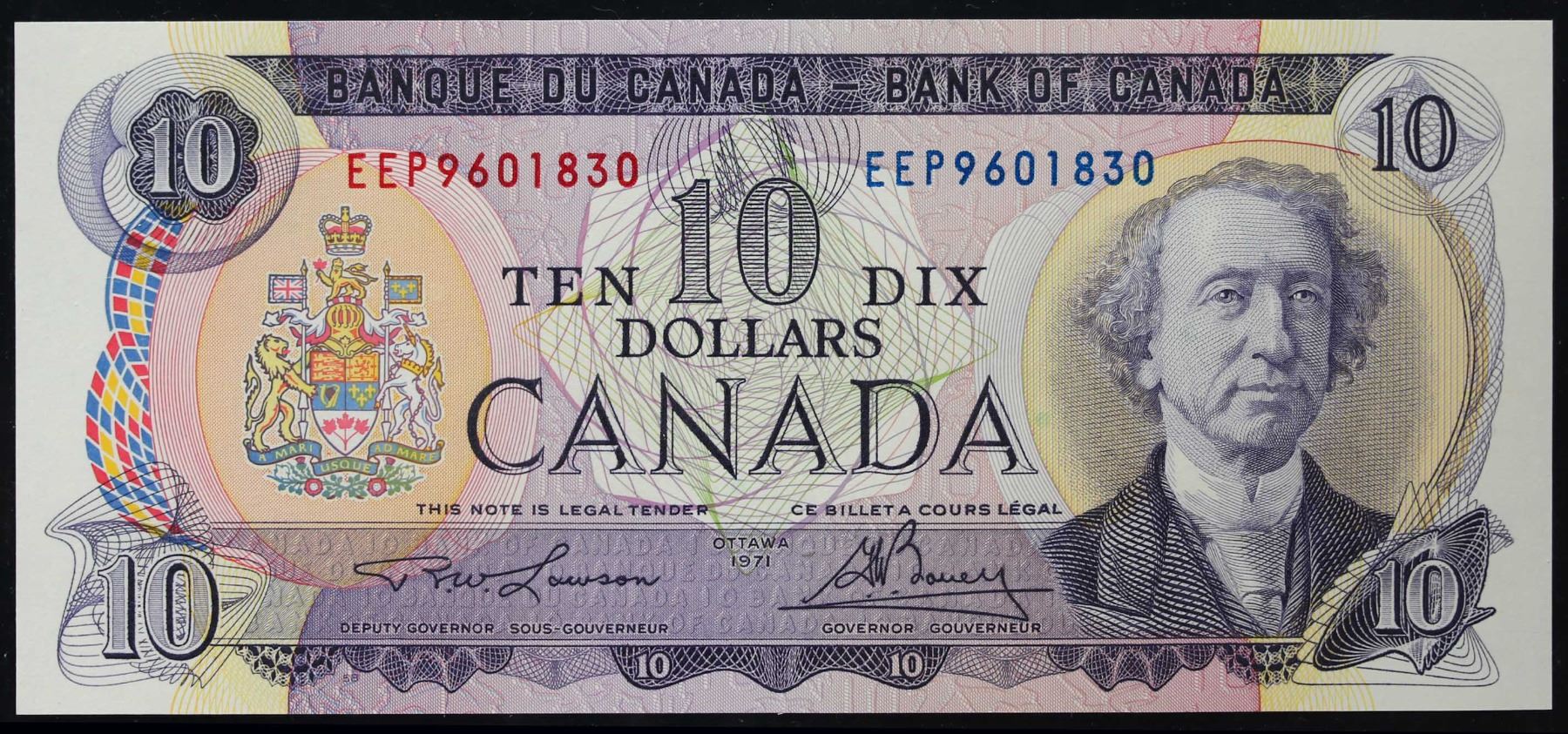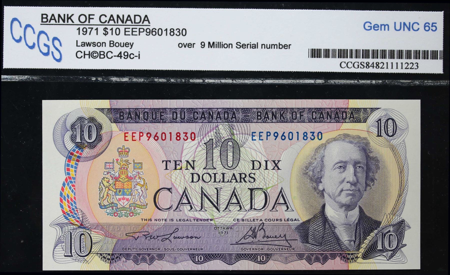 1971 $10 BC-49c-i EEP9601830 CCGS Superb Gem Uncirculated-65PPQ Lawson-Bouey "Good Over" This is a bright and pristine issue with great eye appeal, very large margins and superb embossing. Only a few known examples. We sold a Choice Uncirculated-62 for $35,400. Worth a premium bid