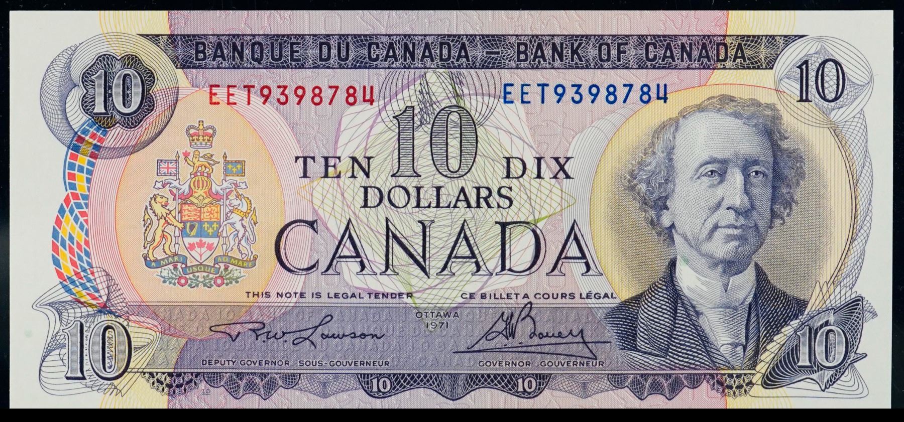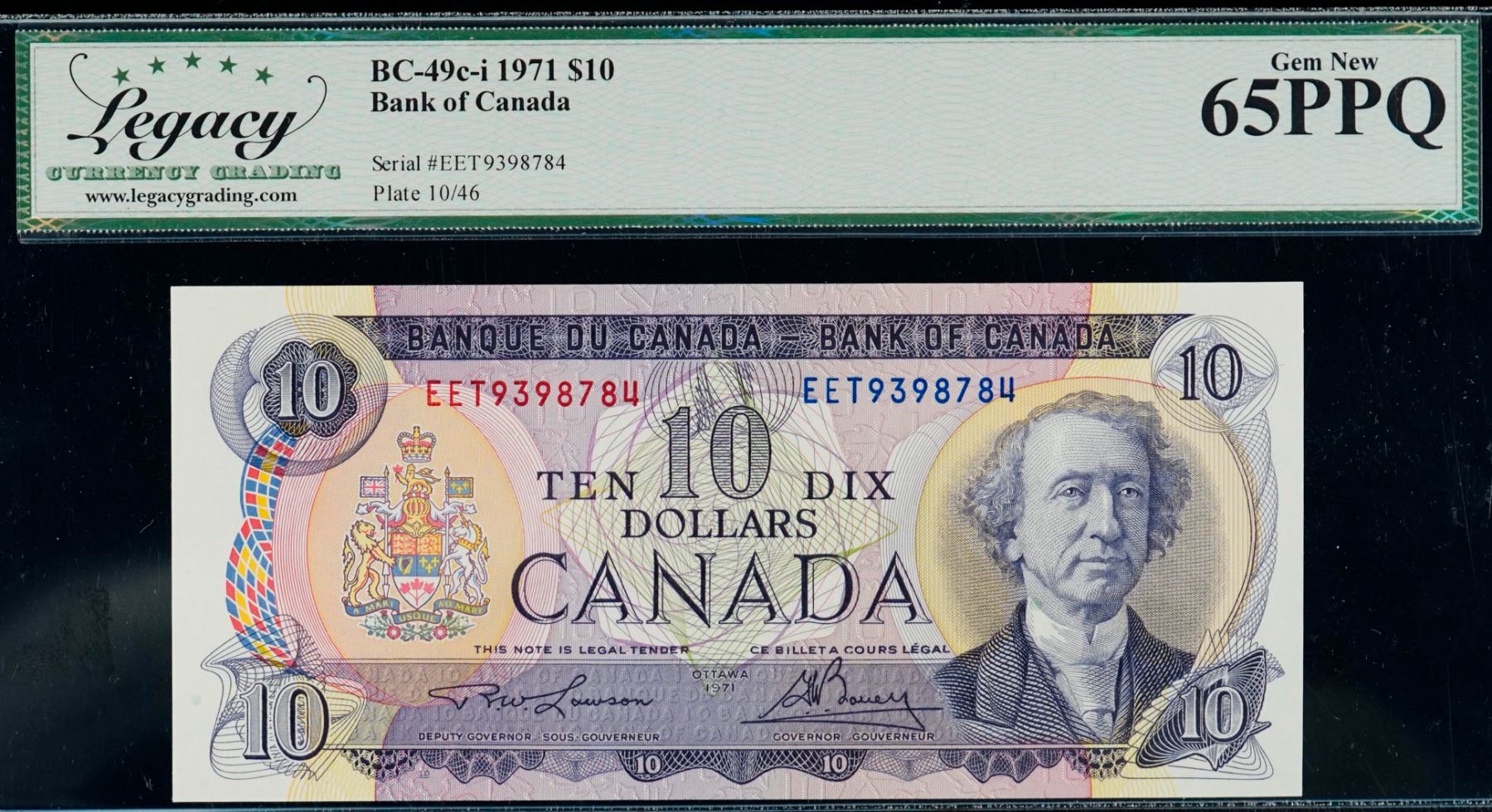 1971 $10 BC-49c-i EET9398784 LCG Uncirculated-65PPQ Lawson-Bouey "Good Over" This is a bright and pristine issue with great eye appeal, very large margins and superb embossing. Less than 20 pieces to exist. Belived to be the finest known example of this modern rarity. Worth a premium bid. A similar example sold for $11,950 at our Prominence X sale.