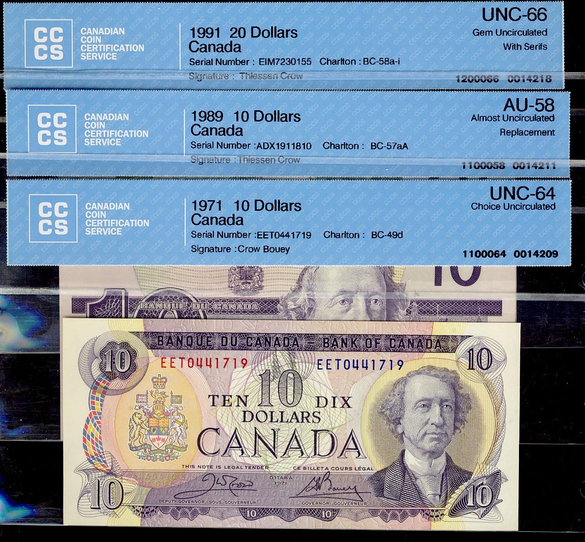 1971 $10 BC-49d #EET0441719 UNC-64, 1989 $10 BC-57aA #ADX1911810 AU-58 and 1991 $20 BC-58a-ii #EIM7230155 UNC66. Lot of three notes both CCCS graded.