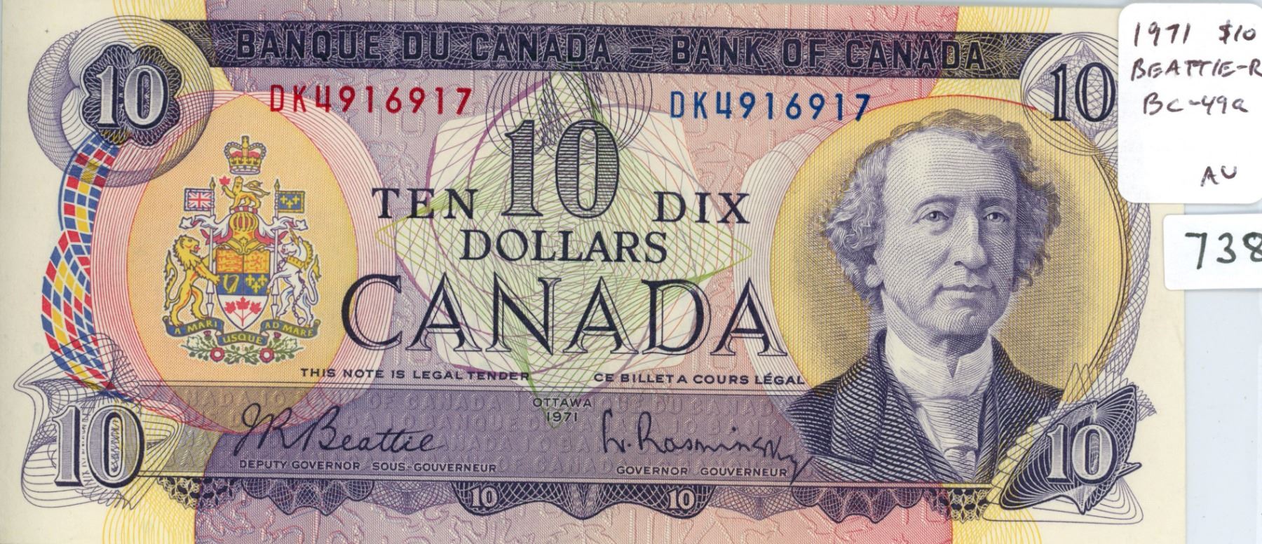 1971 $10. Beattie-Rasminsky signatures. DK Prefix. BC-49a. AU-50.