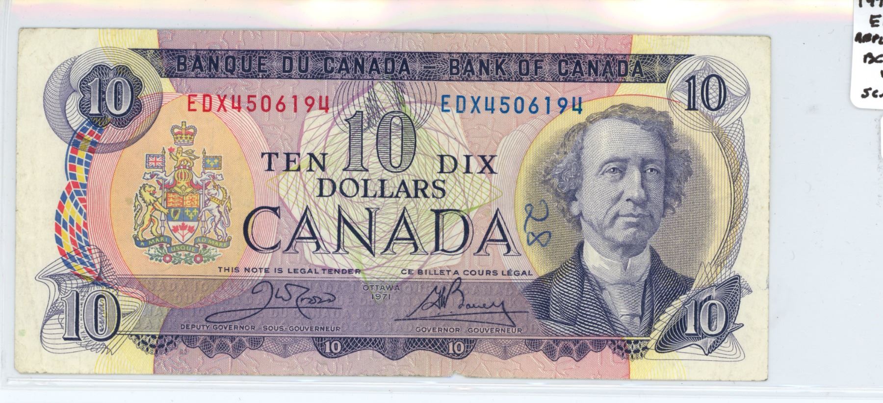 1971 $10 Replacement. Crow-Bouey signatures. EDX Replacement Prefix. BC-49cA-i. VF-20. Scarce Replacement Prefix.