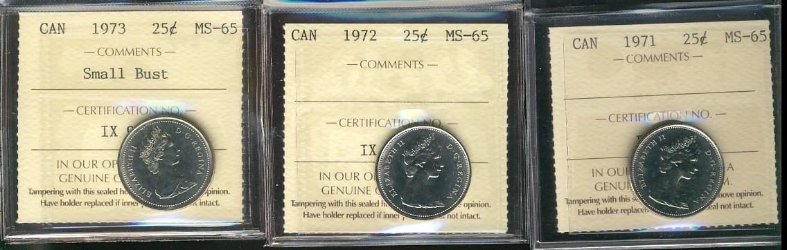 1971, 1972 & 1973 Sml Bust 25¢ ICCS MS65. Lot of 3 coins.