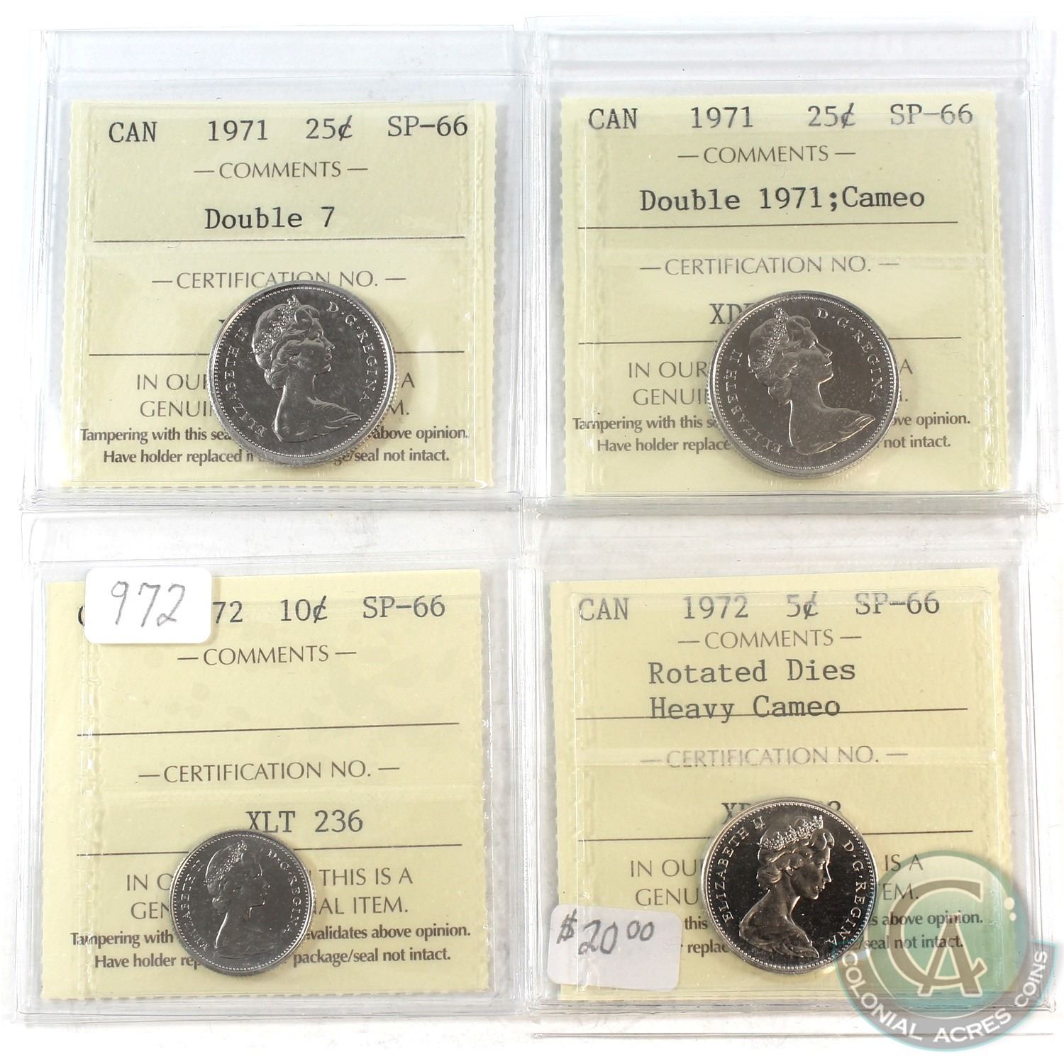 1971-1972 Canada ICCS Certified SP-66 Coin collection with minor Errors. You will receive the following, 1971 25-cent 'Double 7', 1971 25-cent 'Double 1971' Cameo, 1972 10-cent 'Double 972' Not noted on holder, and 1972 5-cent 'Rotated Dies' Heavy Cameo. 4pcs.