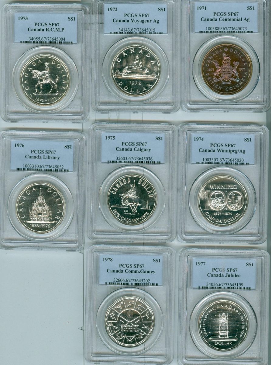 1971-1978 $1 PCGS SP67. Lot of eight commerative silver UNC dollars. Includes 1971 Canada Centennial, 1972 Voyageur, 1973 RCMP, 1974 Winnipeg, 1975 Calgary, 1976 Ottawa Library, 1977 Jubilee and 1978 Edmonton Commonwealth Games.