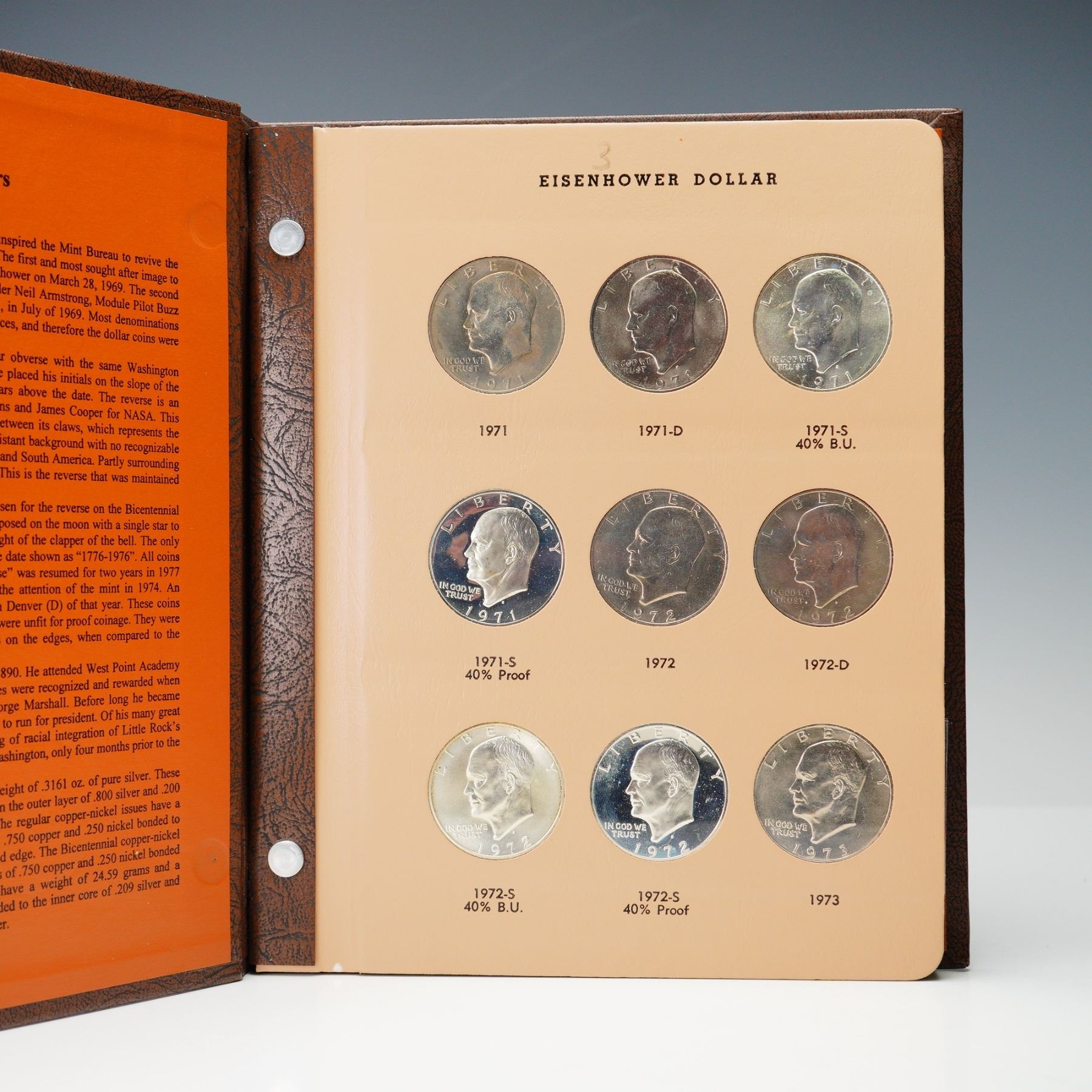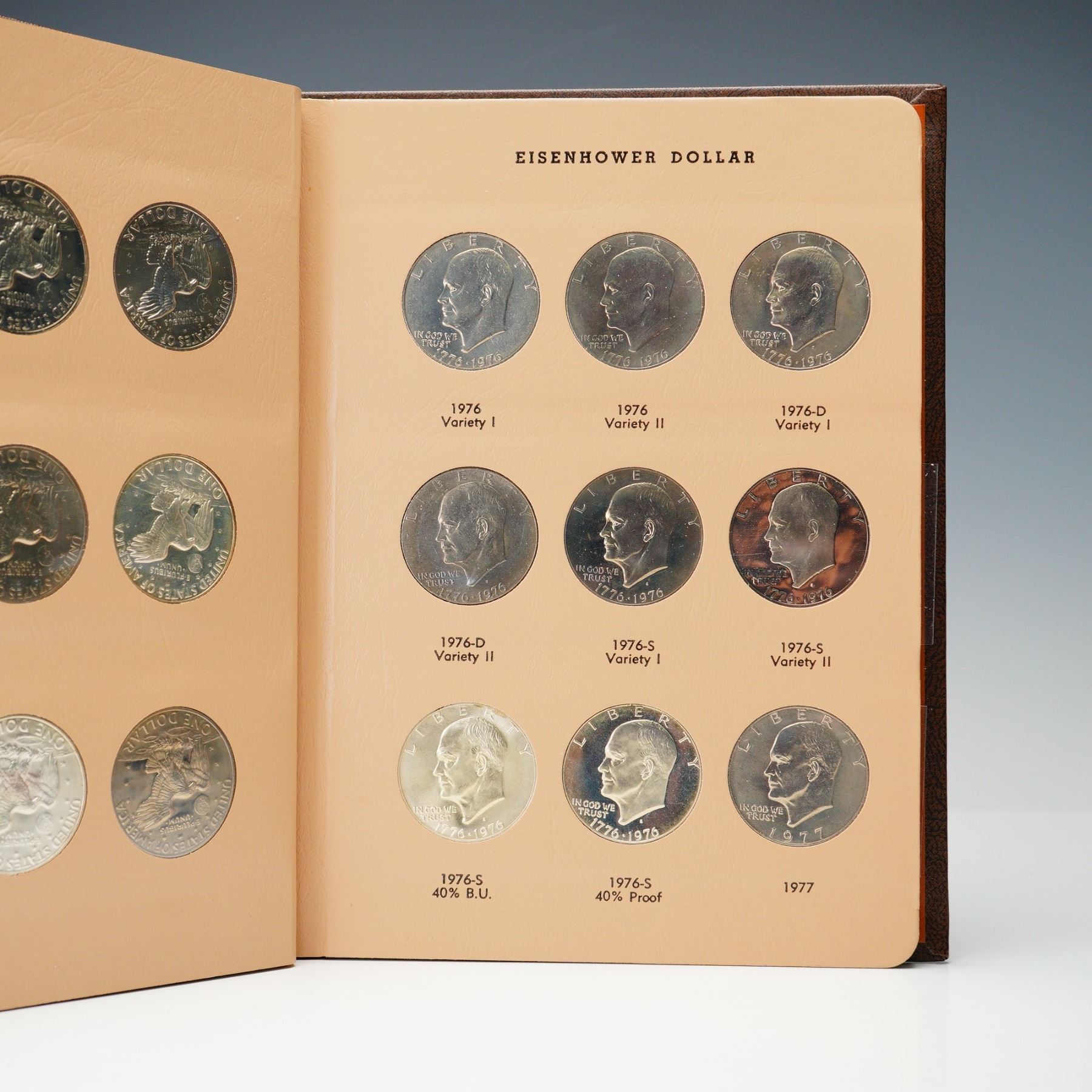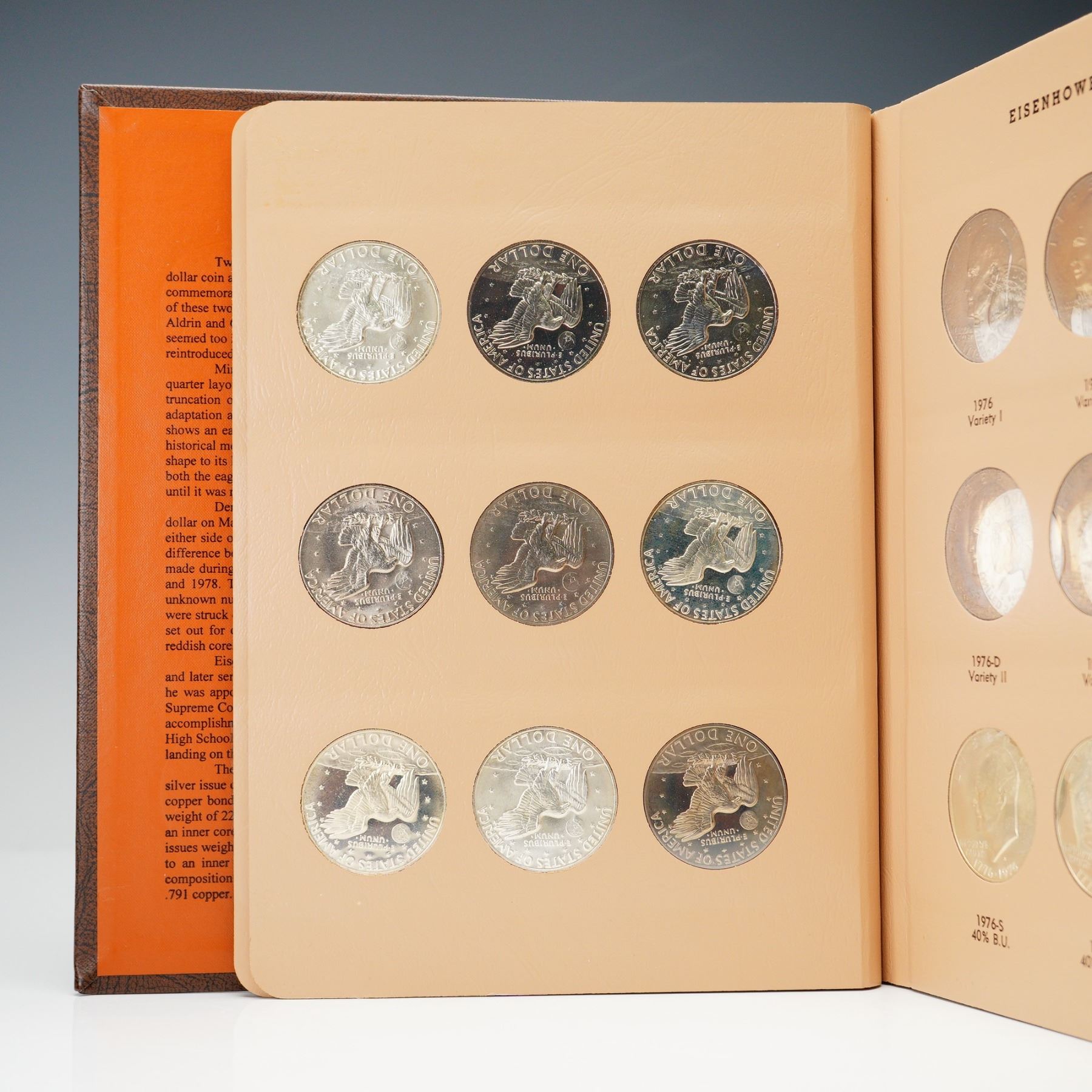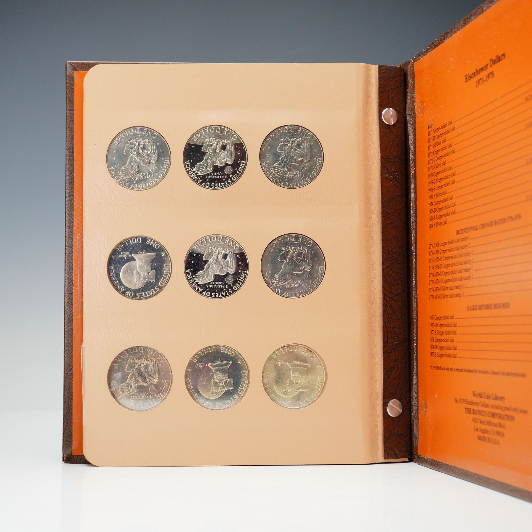 Complete Eisenhower dollar set spanning 1971 to 1978, presented in a Dansco World Coin Library album (No. 8176), with all business strikes and proof-only issues represented. This 32-coin set includes key 40% silver examples in both Brilliant Uncirculated and Proof finishes, as well as the 1973-S Clad Proof, 1976 Bicentennial Type I and II varieties, and 1977-1978 proof issues. Coins range from attractive circulated to fully brilliant uncirculated and deep cameo proof examples. A thorough and highly desirable run for modern dollar collectors.