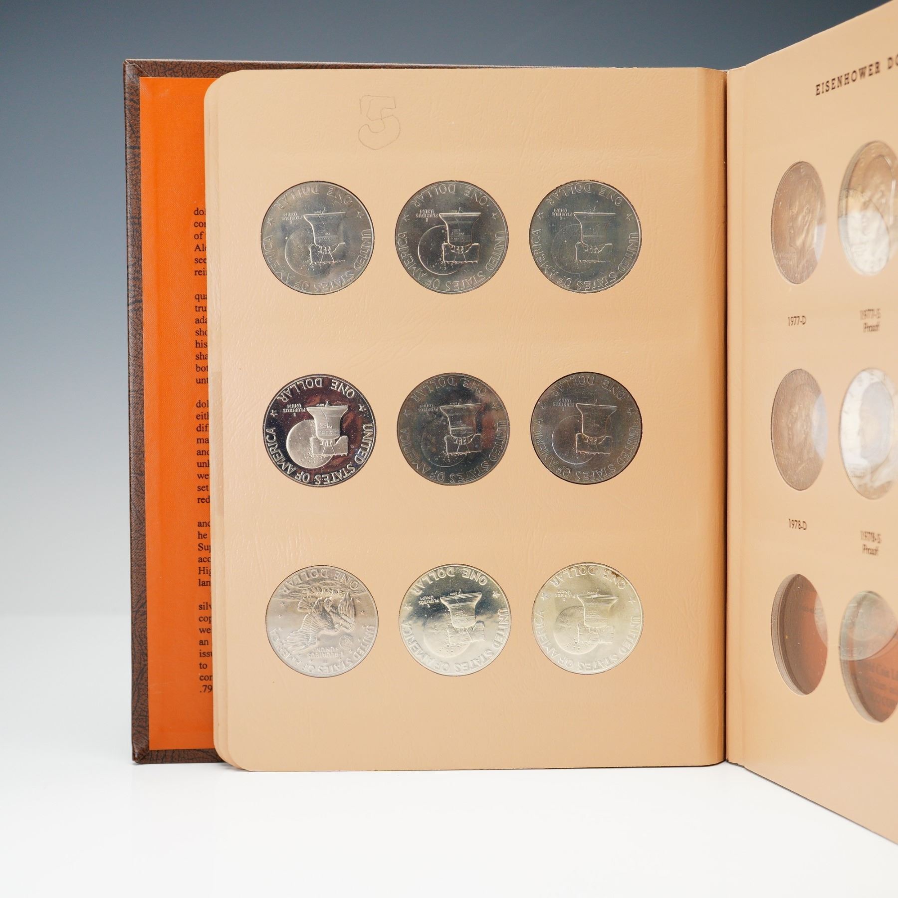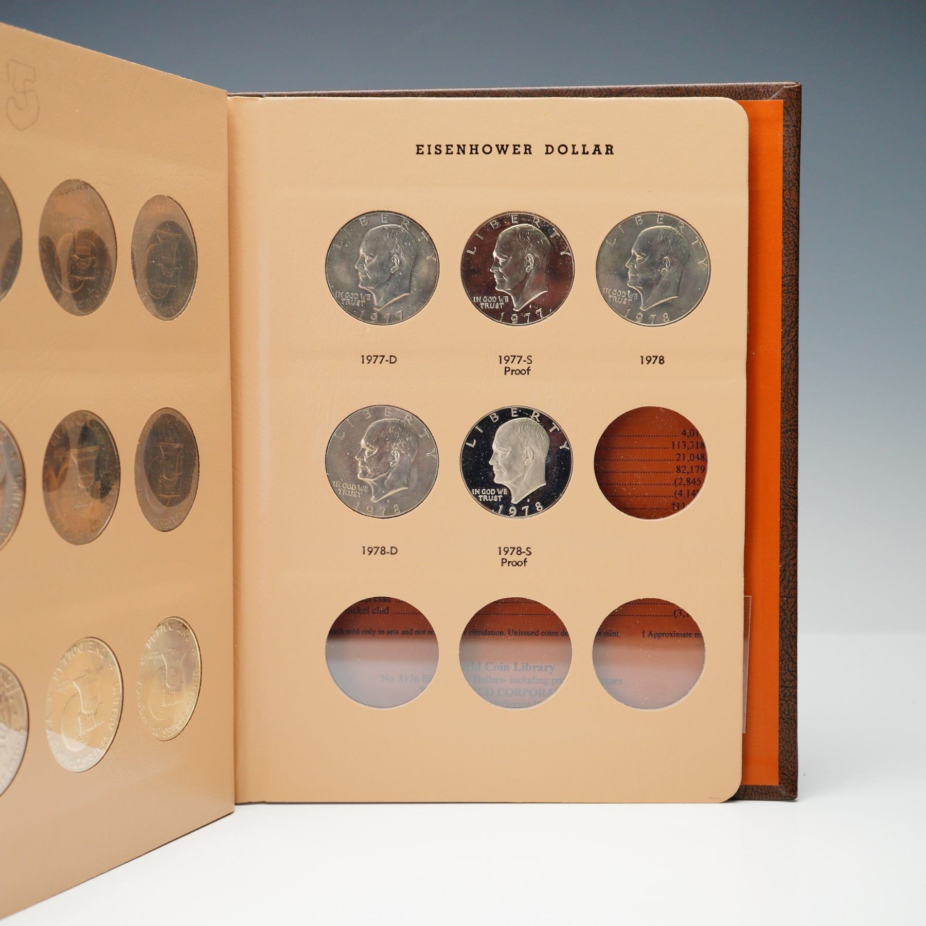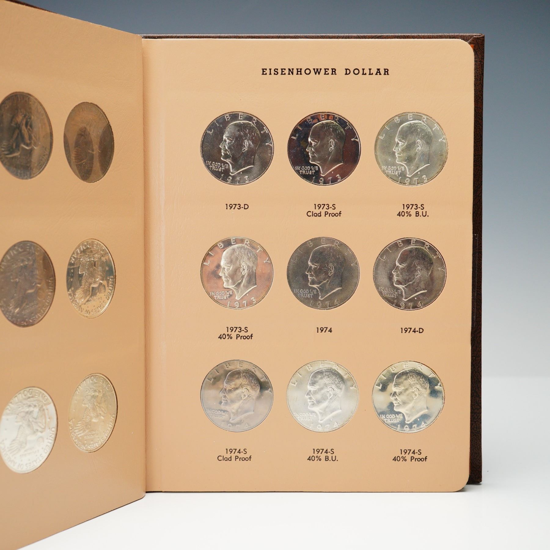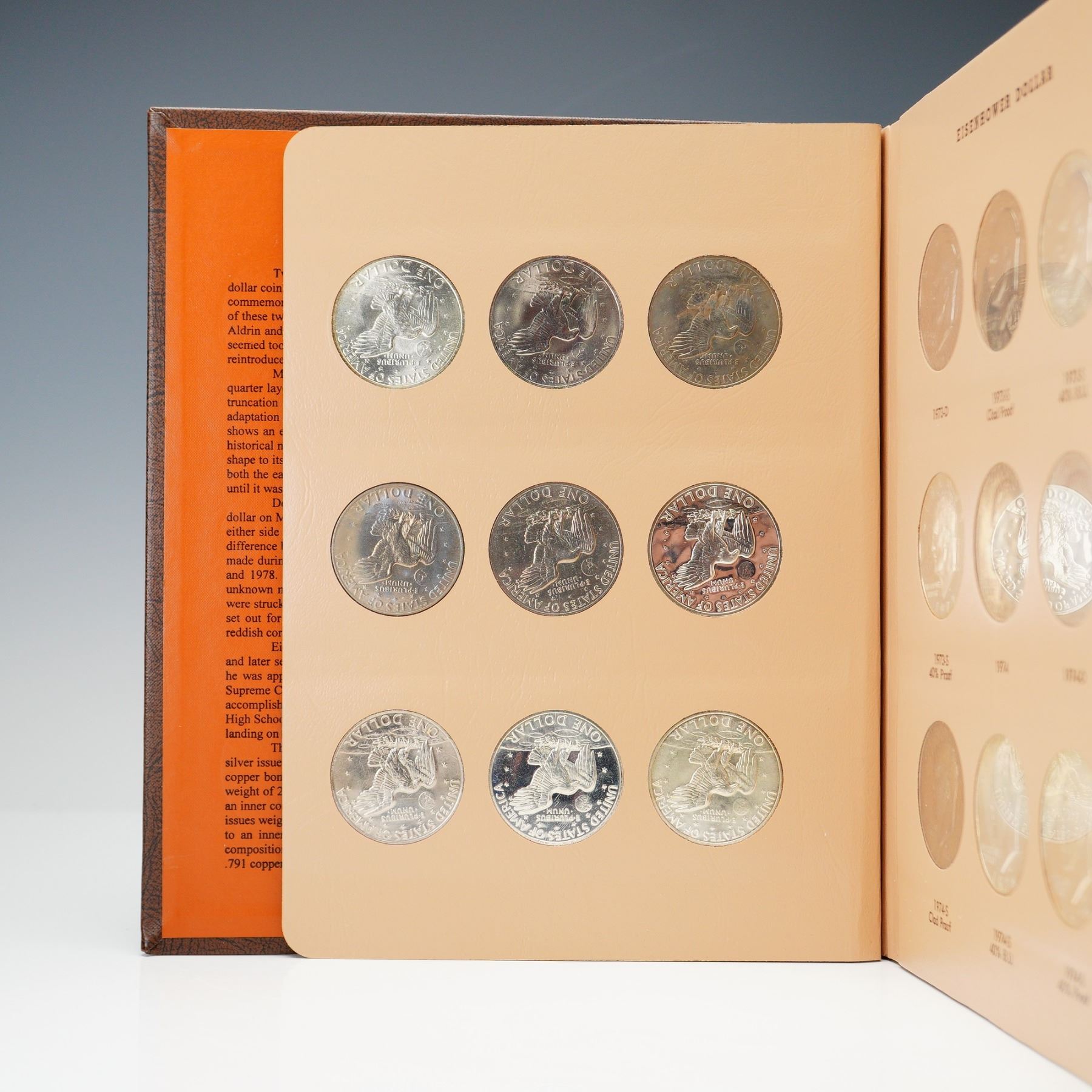 Complete Eisenhower dollar set spanning 1971 to 1978, presented in a Dansco World Coin Library album (No. 8176), with all business strikes and proof-only issues represented. This 32-coin set includes key 40% silver examples in both Brilliant Uncirculated and Proof finishes, as well as the 1973-S Clad Proof, 1976 Bicentennial Type I and II varieties, and 1977-1978 proof issues. Coins range from attractive circulated to fully brilliant uncirculated and deep cameo proof examples. A thorough and highly desirable run for modern dollar collectors.