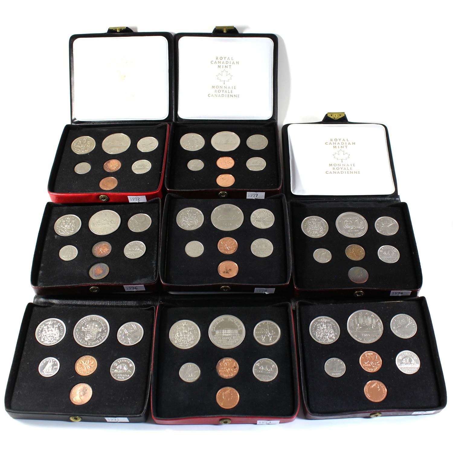 1971-1980 Canada Specimen Double Penny Set Collection. You will receive each date from 1971 to 1980 except for 1985 and 1989. Please note coins may contain toning, and cases may show signs of age. 8pcs.