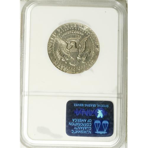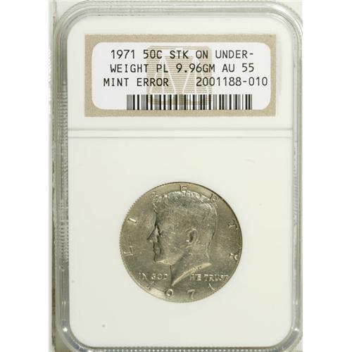 <B>1971 50C Kennedy Half--Struck on an Underweight Planchet--AU55 NGC.</B></I> 9.96 grams. A typical 1971 half dollar should weigh 11.34 grams. This example has unusually narrow rims, but otherwise has a normal appearance. Lustrous and lightly toned with moderate facial marks and peripheral coin counter abrasions. The U.S. Mint struck coins for Israel, Liberia, Panama, and the Philippines in 1971, but none of these issues approximate the weight and diameter of the present piece.<BR><BR><b>Shipping:</b> Coin/Currency (<a target="_blank" href="http://www.heritageauctions.com/common/shipping.php">view shipping information</a>)