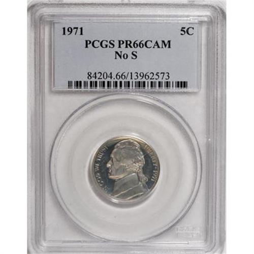 <B>1971 5C No S PR66 Cameo PCGS.</B></I> This popular modern rarity displays a light coat of champagne-gold, and is immaculately preserved. Sharply struck, and exhibiting excellent cameo contrast.<BR><BR><b>Shipping:</b> Coins & Currency (<a target="_blank" href="http://www.heritageauctions.com/common/shipping.php">view shipping information</a>)