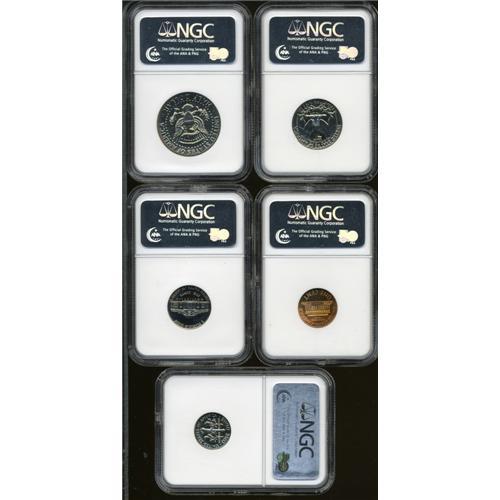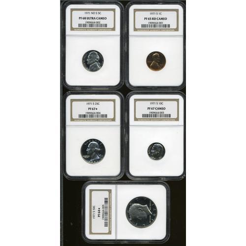 <B>1971 5C No S PR68 Ultra Cameo NGC. Part of a Five-Piece 1971-S Proof Set.</B></I> The No S nickel is razor-sharp, and is essentially as made aside from a hint of apricot toning. A scarce mint error. The other four pieces in the set include: <B>cent PR65 Red Cameo; dime PR67 Cameo; quarter PR67 S;</B></I> and a <B>half dollar PR65 S.</B></I><BR><BR><b>Shipping:</b> Coins & Currency (<a target="_blank" href="http://www.heritageauctions.com/common/shipping.php">view shipping information</a>)
