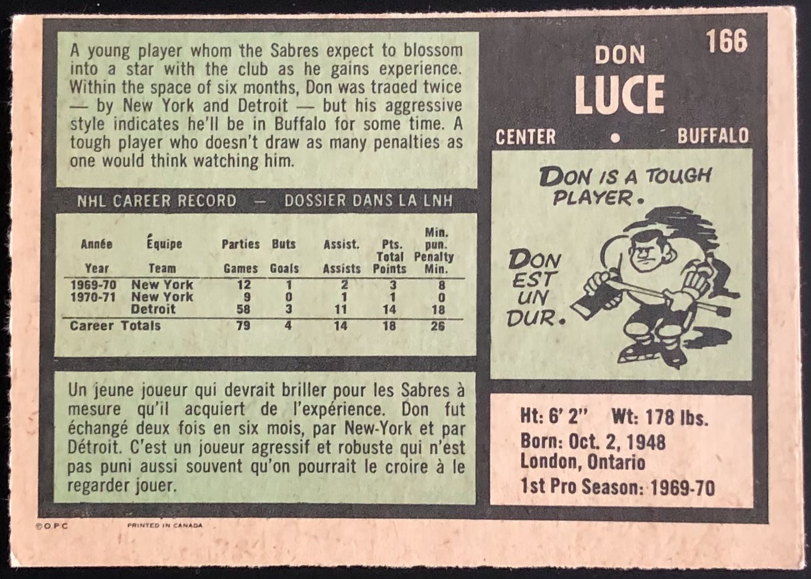 Card #166 NHL, hockey, vintage, OPC, rookie
