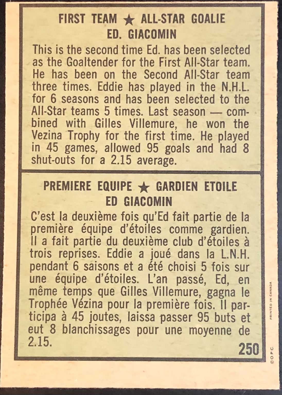 Card #250 NHL, hockey, OPC, vintage, hall of fame