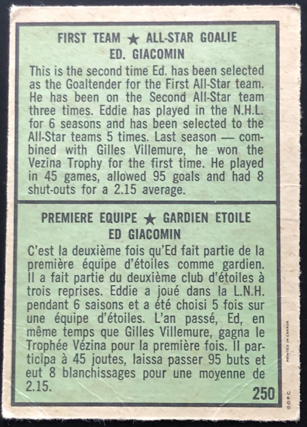 Card #250 NHL, hockey, OPC, vintage, hall of fame