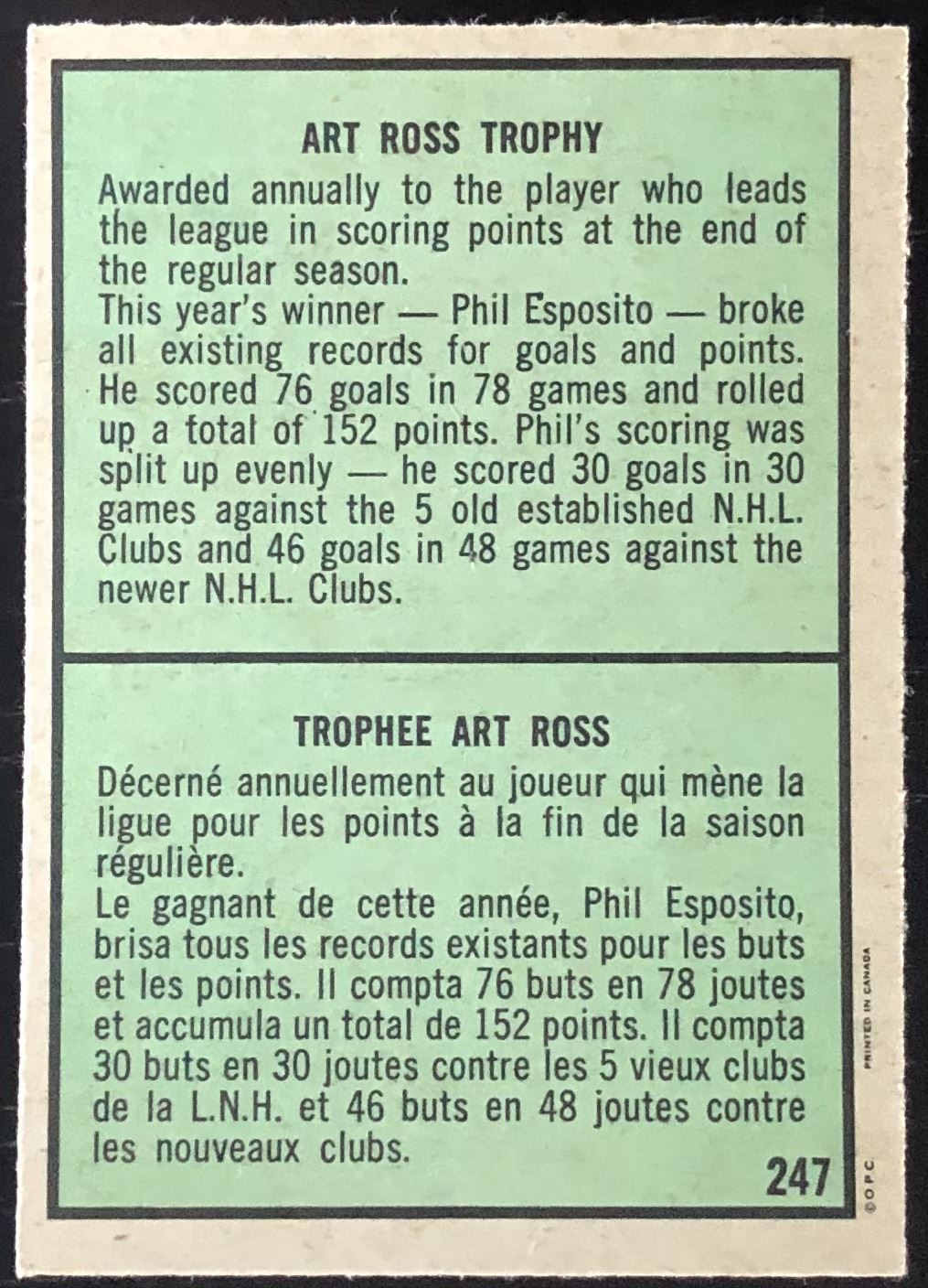 Card #247 NHL, hockey, OPC, hall of fame, vintage