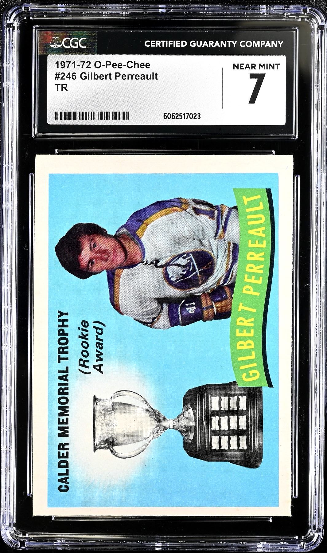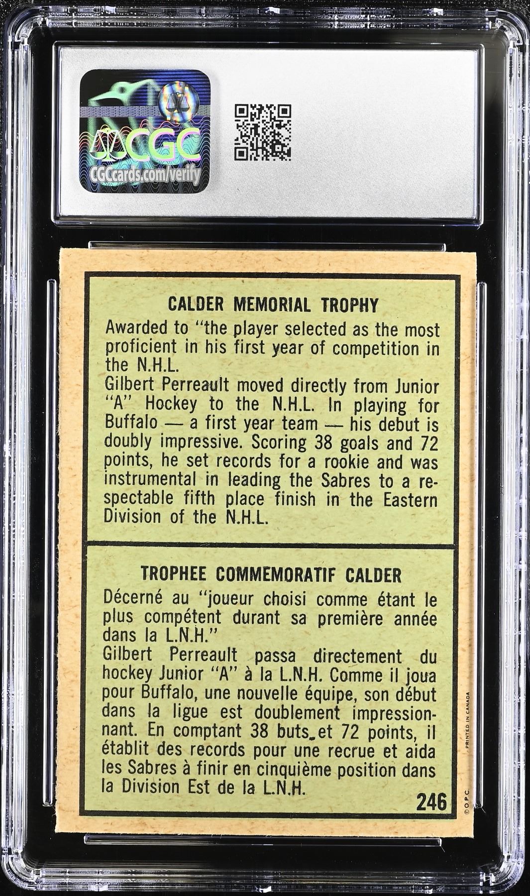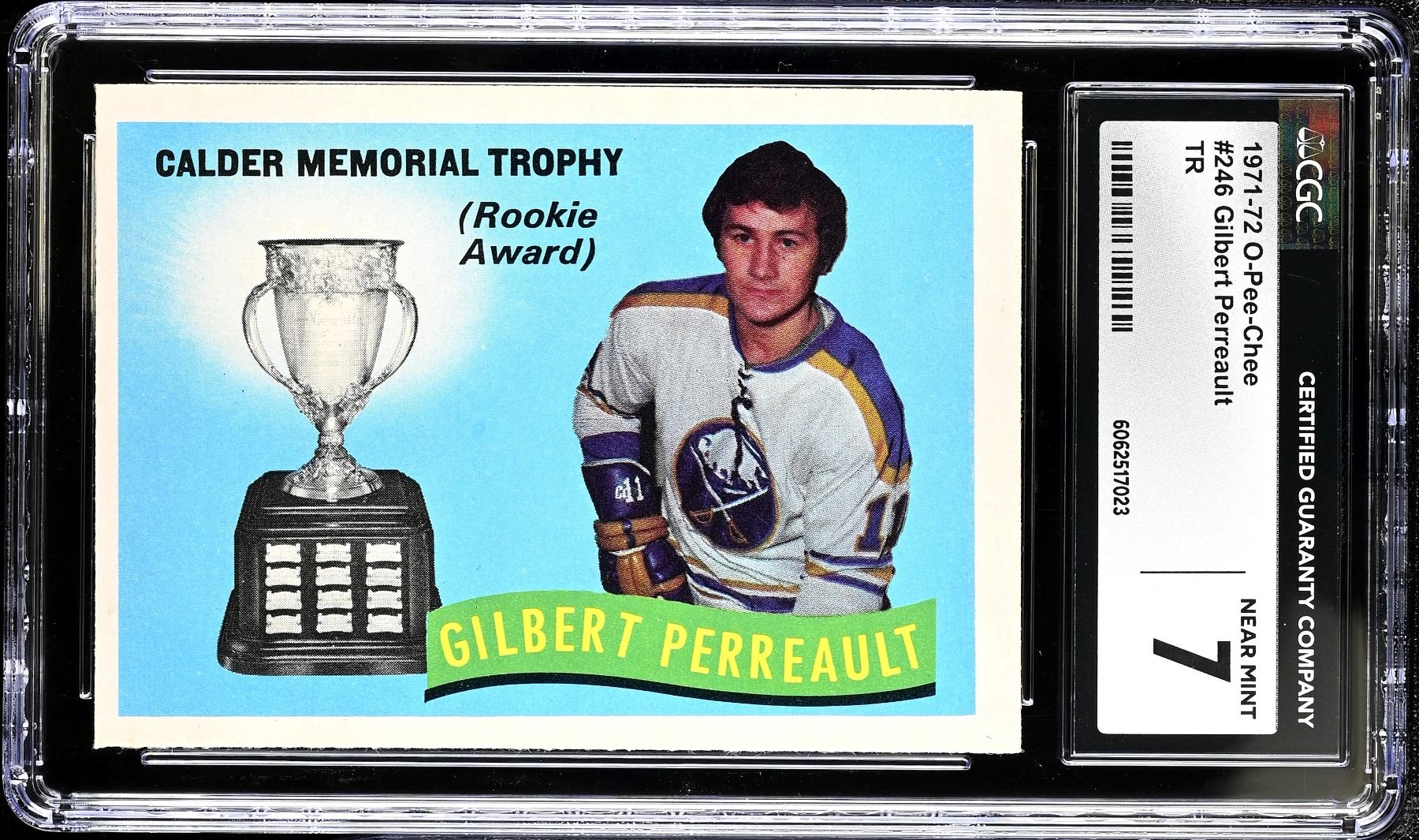 Sharp card commemorating HOF Gilbert Perreault's 1970-71 Rookie of the Year award. Graded 7 NM by CGC.